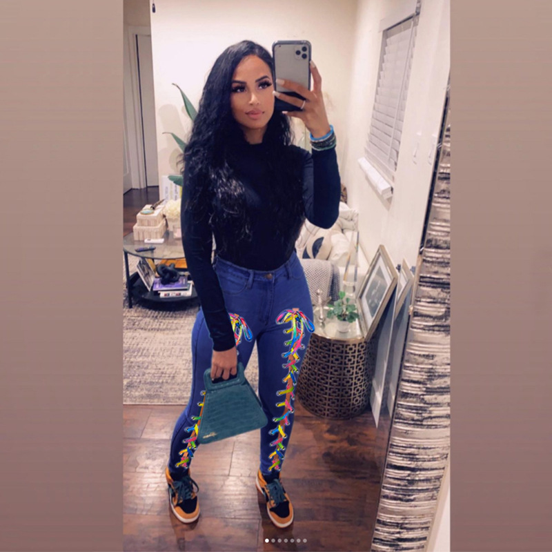 유럽과 미국 그물 레드 캐주얼 프론트 레이스 컬러 로프 데님 바지 아마존 AliExpress 대외 무역 수출 공장 직판스토어 가기