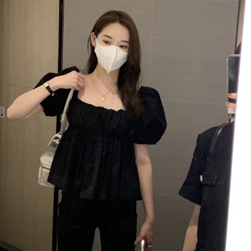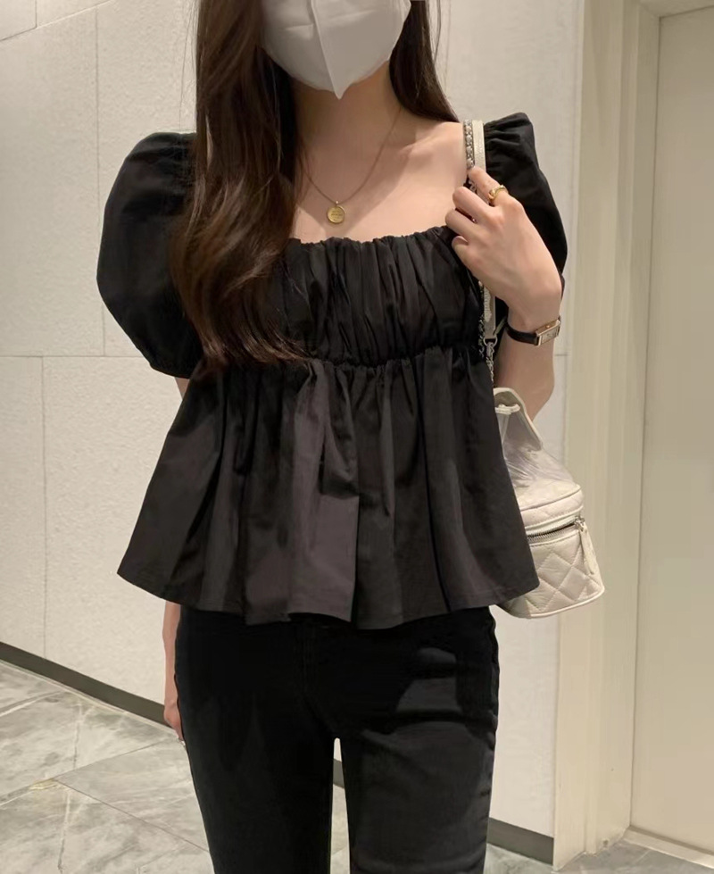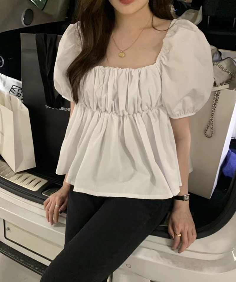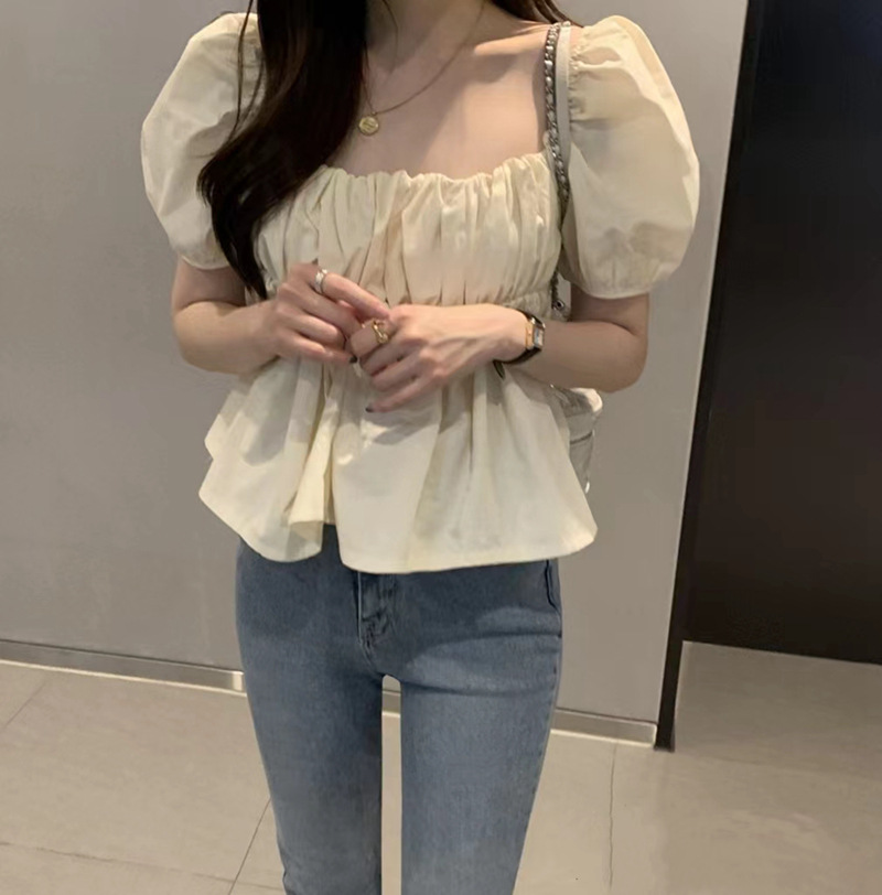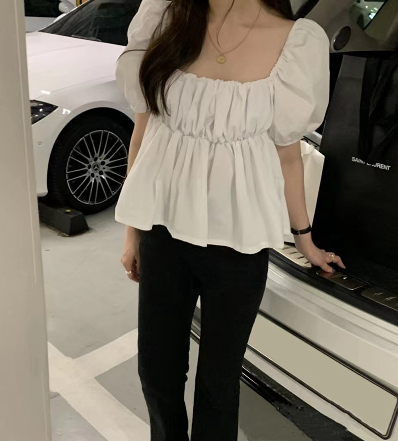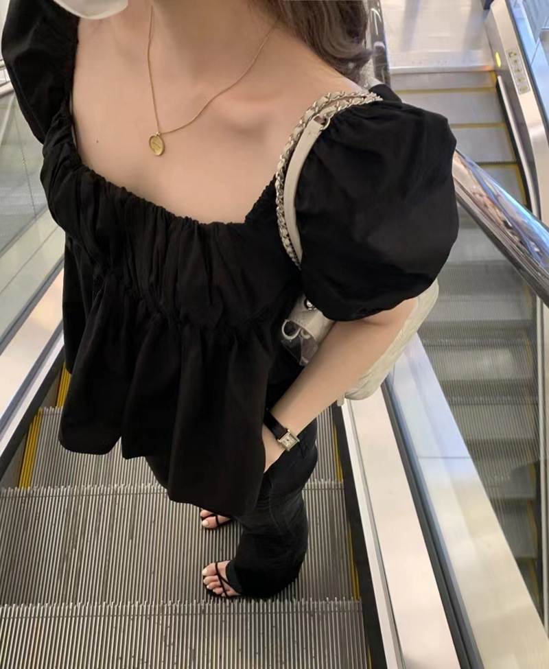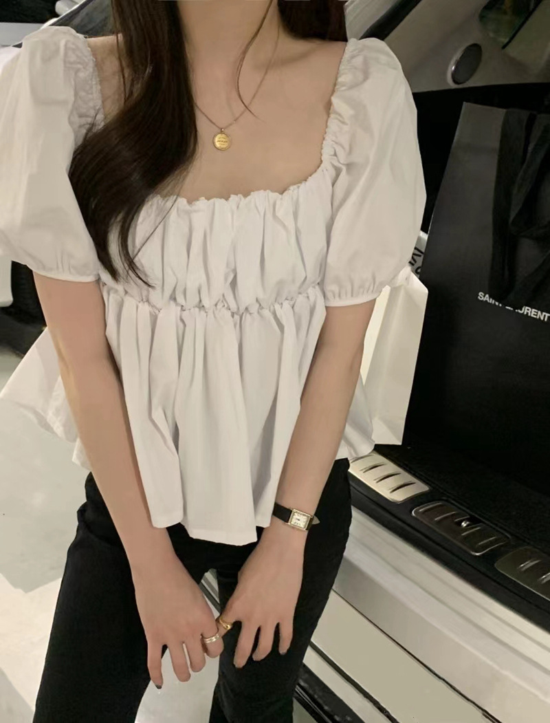 2022 여름 새로운 한국 달콤한 주름 라인 여성용 대형 스퀘어 칼라 퍼프 슬리브 반팔 셔츠