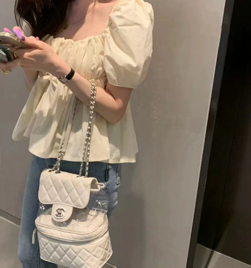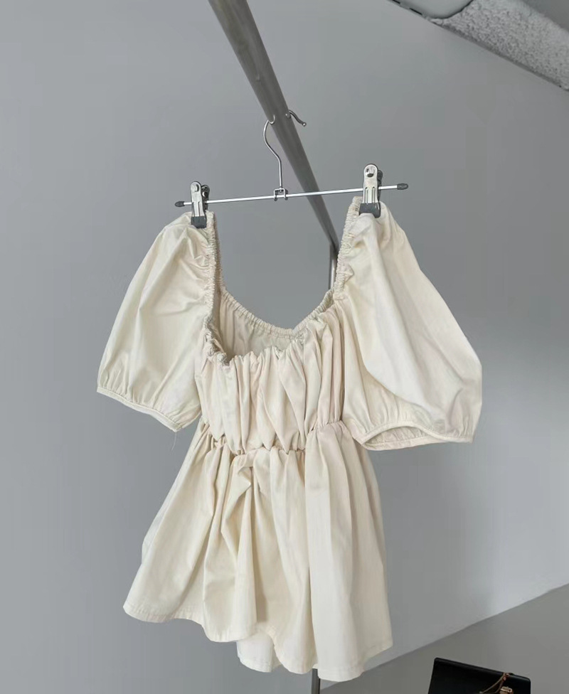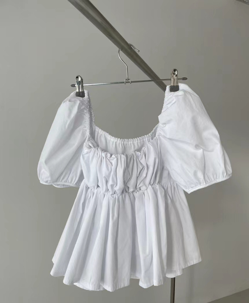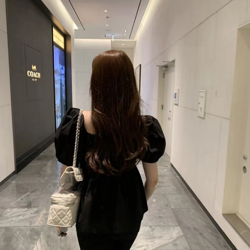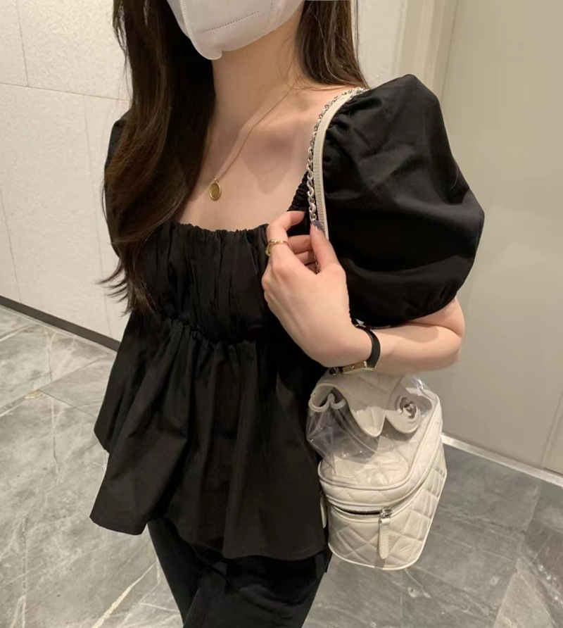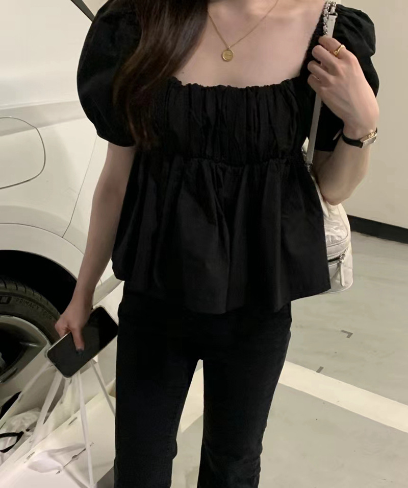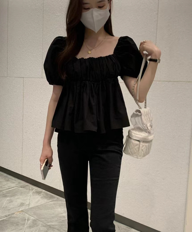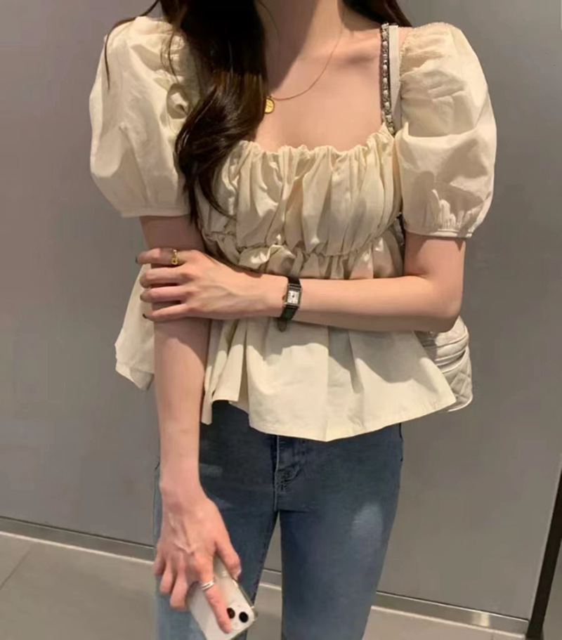 2022 여름 새로운 한국 달콤한 주름 라인 여성용 대형 스퀘어 칼라 퍼프 슬리브 반팔 셔츠