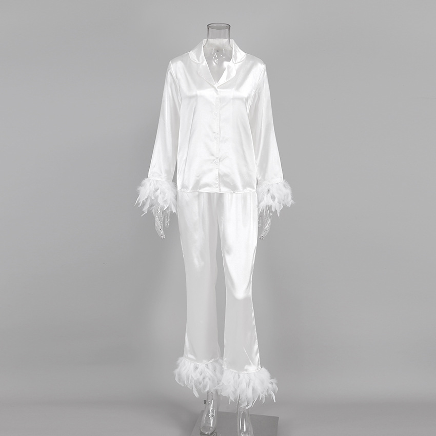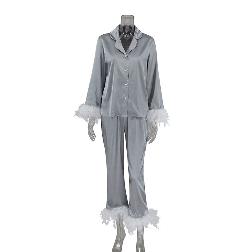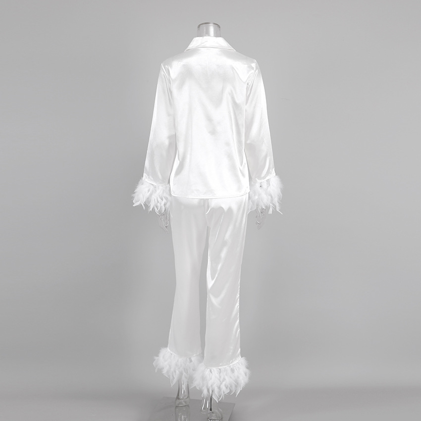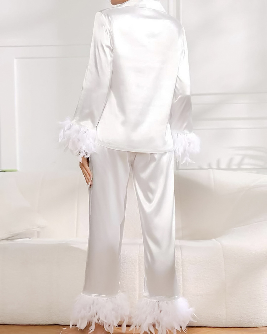 2026 봄 유럽 및 미국 스타일 아이스 실크 잠옷, 패셔너블한 타조털 셔츠와 긴 바지, 루즈핏 투피스 깃털 홈웨어 여성용