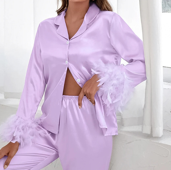 2026 봄 유럽 및 미국 스타일 아이스 실크 잠옷, 패셔너블한 타조털 셔츠와 긴 바지, 루즈핏 투피스 깃털 홈웨어 여성용스토어 가기
