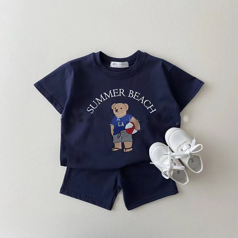 한국 스타일 아동복 아기 소년과 소녀 아기 여름 새로운 만화 스마일 낙서 세트 만화 두 조각 세트