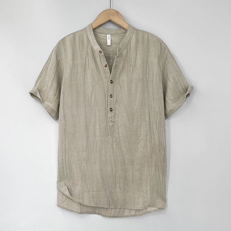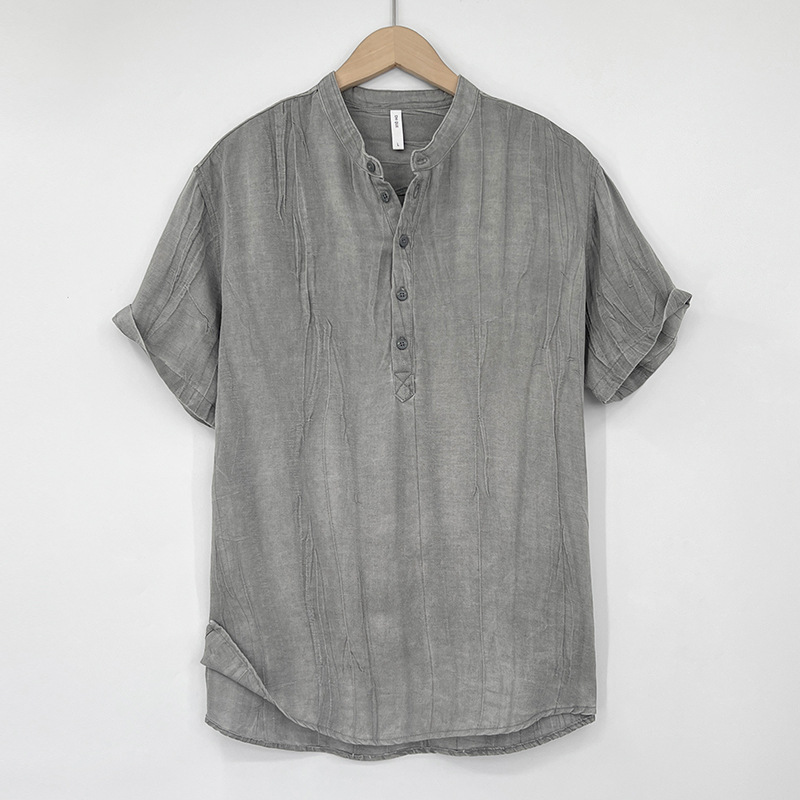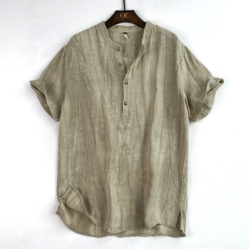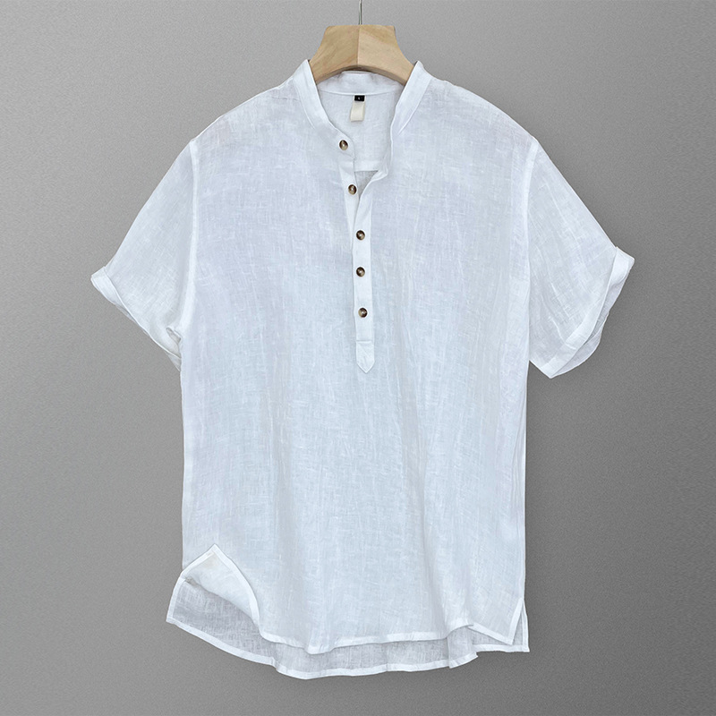 23T01 하이 엔드 퓨어 린넨 반팔 티셔츠 남성 여름 얇은 중국 스타일 스탠드 칼라 반팔 루즈 캐주얼 탑