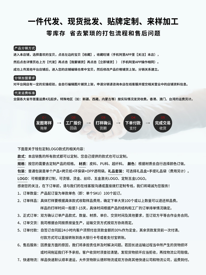 钱包裸包发货标准:单品拷贝纸+环保袋+OPP透明袋+泡沫袋+卡片