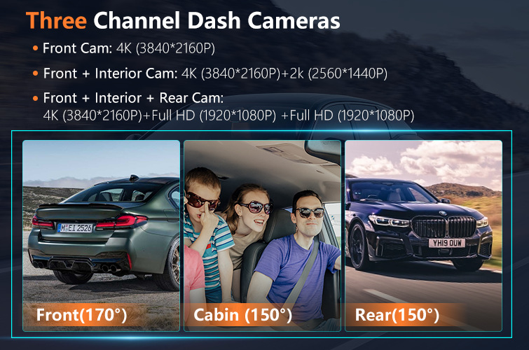 Com sensor Sony STARVIS IMX335 e cabine 4 luzes LED infravermelhas, que podem capturar gravação 4K (3840*2160P) frontal + 1080P interna + 1080P traseira de 3 canais. Também, capturar UHD 4K (2160P) Front + 2K (1440P) Cabine Dual gravação durante o dia e noite. Dá-lhe a proteção completa dianteira 170 ° + traseira 150 ° + cabine 150 °. BEPOCAM dash cam 4K funciona bem para carros, SUVs, jipes e caminhões.