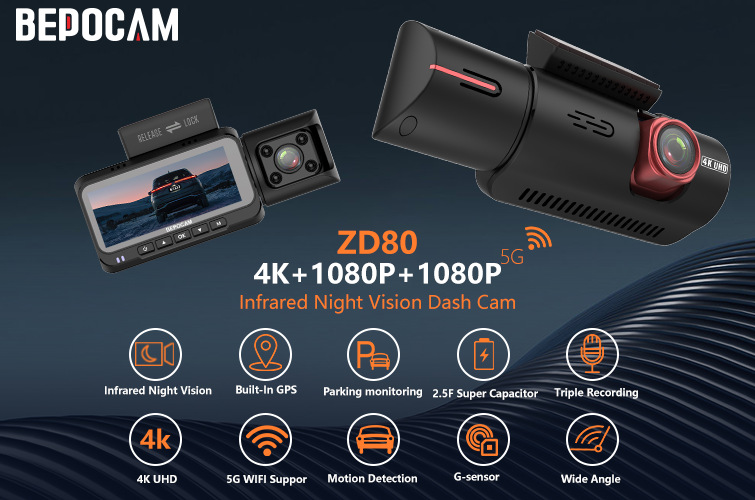 BEPOCAM ZD80 4K + 1080P + 1080P Dash Cam 3 Câmeras GPS Tracker embutido 5G WiFi Infravermelho Visão Noturna Carro DVR Veículo Traço Câmera