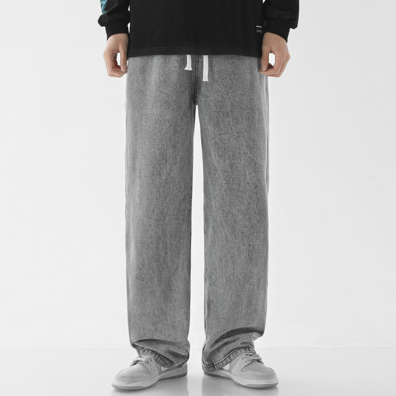 무추 남성복∣가을 겨울 신상품 신탕 데님 팬츠 남성용 루즈핏 스트레이트 하이 스트리트 밴딩 허리 캐주얼 와이드 팬츠