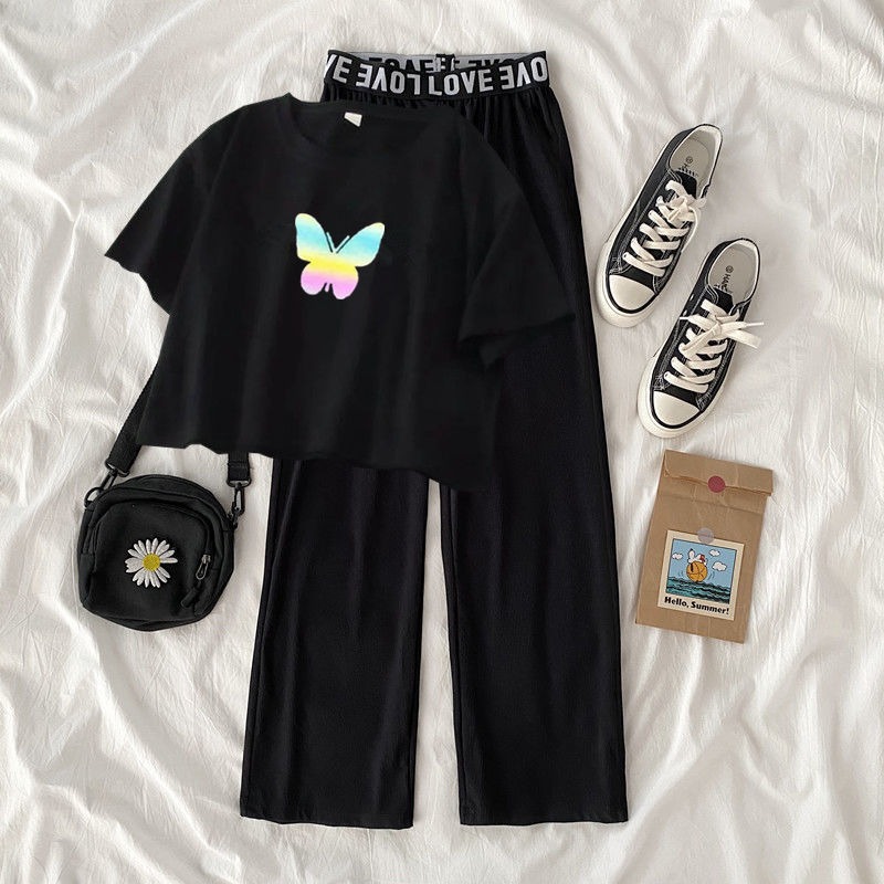 중년 및 노년층 소녀 스포츠 정장 2025 여름 새로운 스타일 반사 인쇄 라운드 넥 반팔 와이드 레그 팬츠 투피스 트렌디 세트스토어 가기