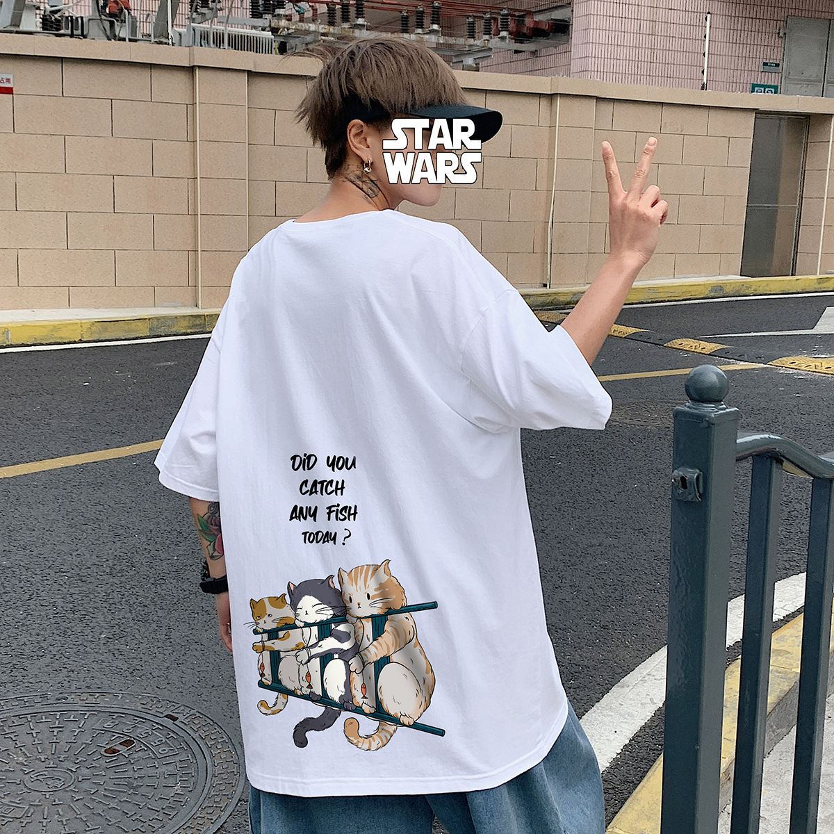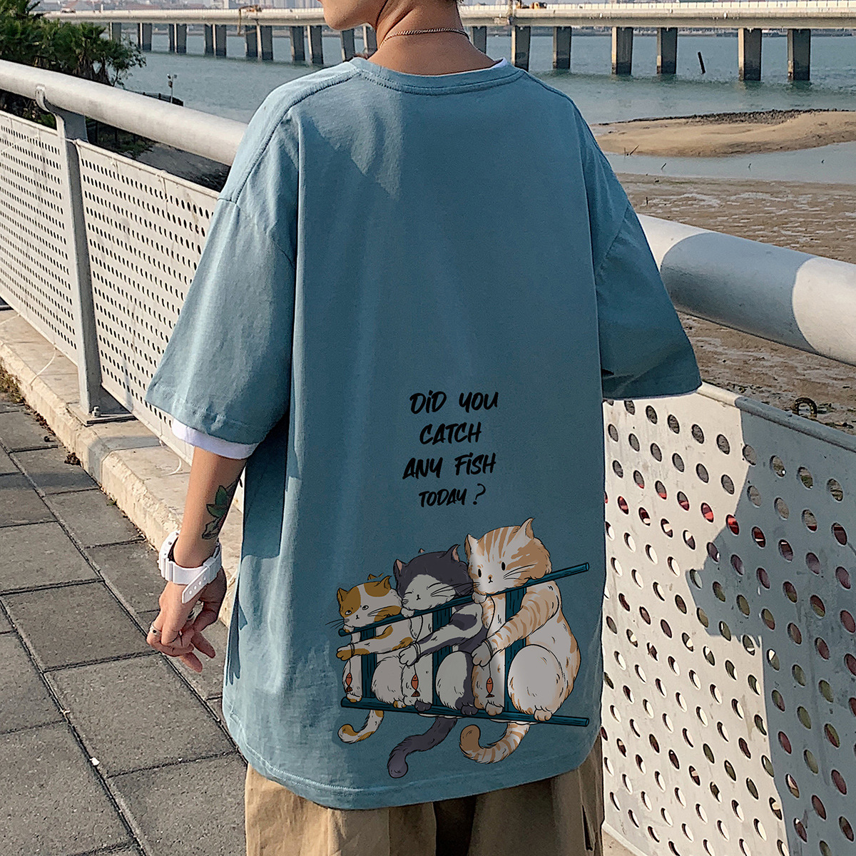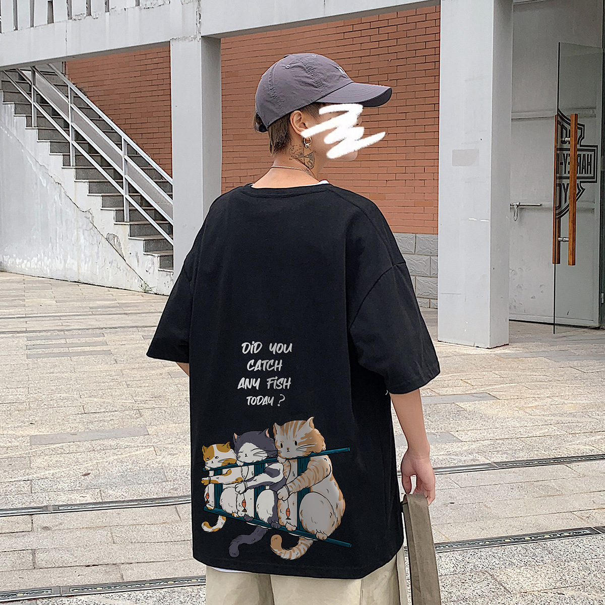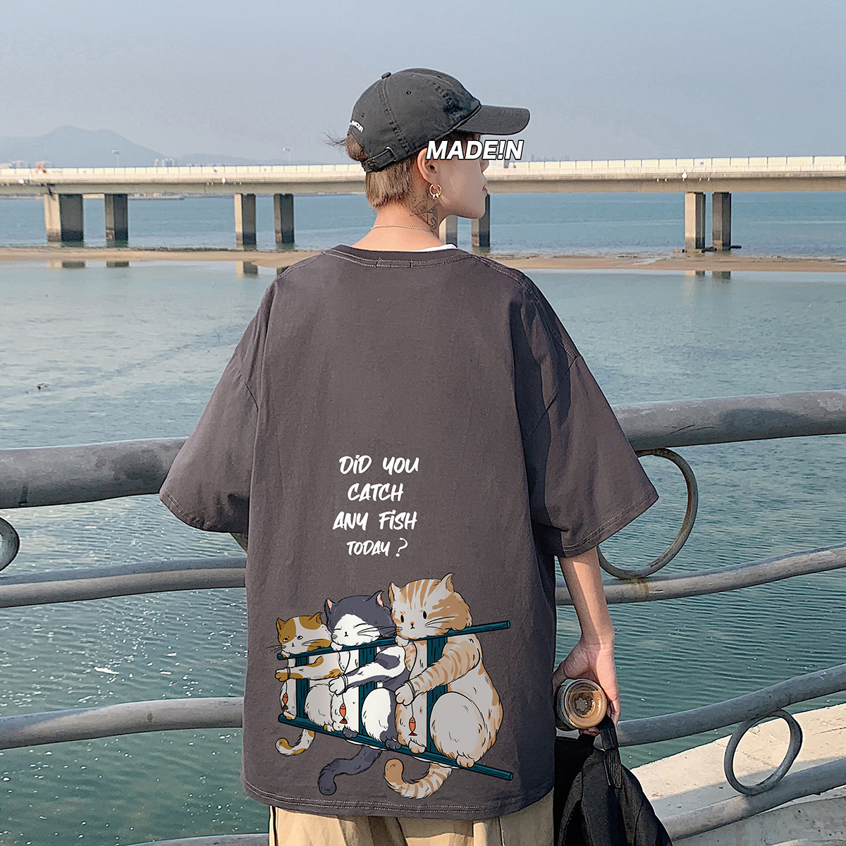 2024 년 여름 새로운 남자 세 고양이 인쇄 티셔츠 유행 일본 스타일 느슨한 남자의 반소매 기초 셔츠 트렌디