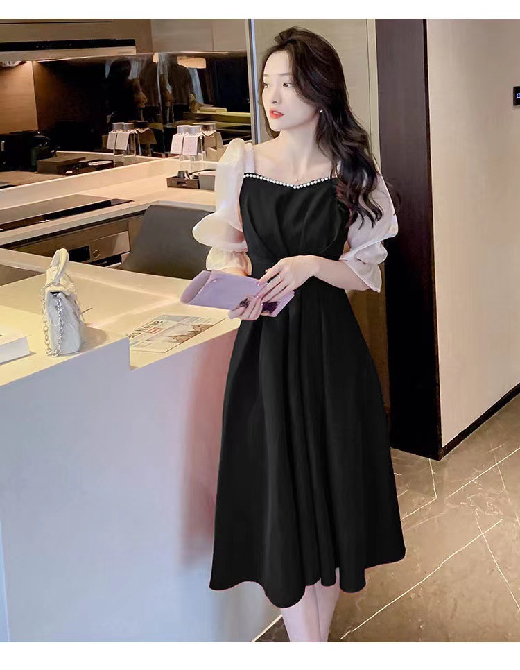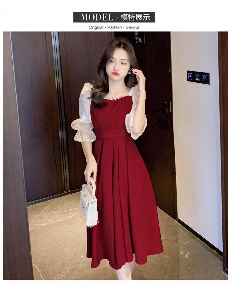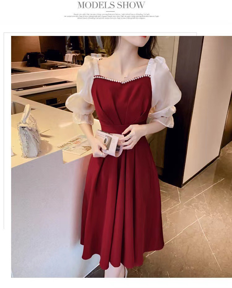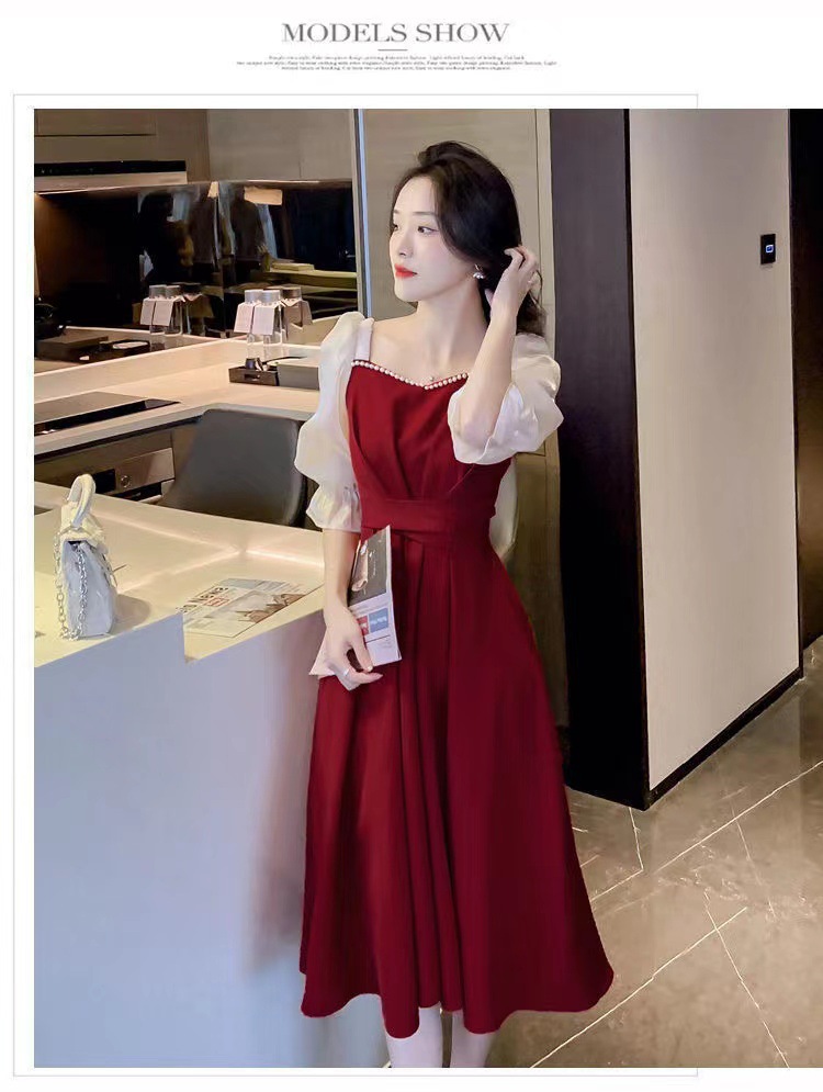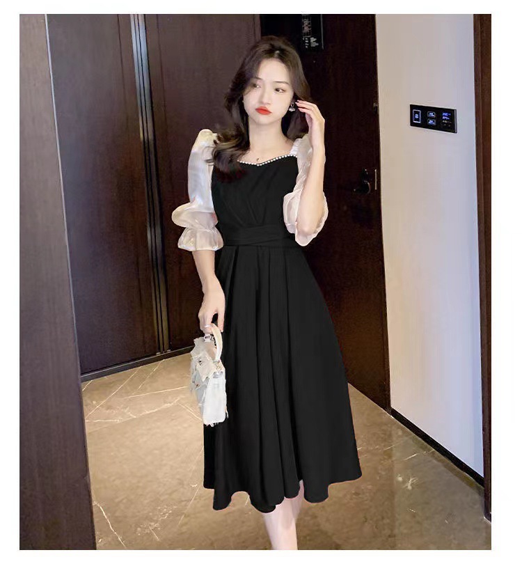 프랑스 단색 원피스 여자의 반팔 여름 크로스 보더 새로운 허리 슬리밍 중간 길이 공주 A 라인 스커트스토어 가기