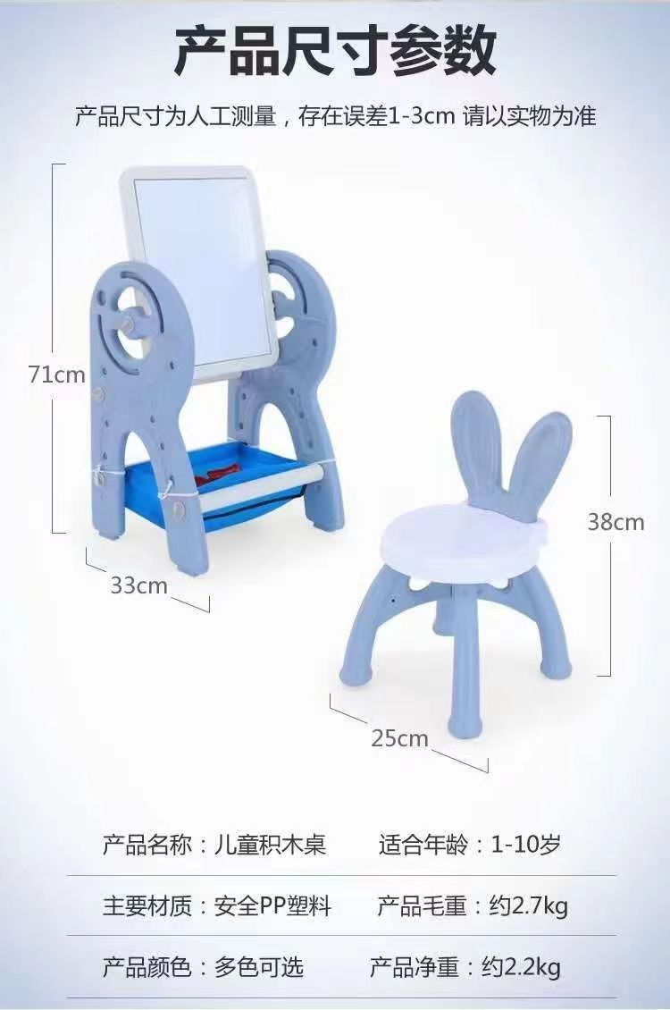 多功能儿童玩具积木桌画板 每套包含椅子+画板积木桌+2支笔+积木块。单包体积39*15*55cm重2.8kg 大包装一箱6个无内盒,外箱体积56*39*70cm重15kg,标价是大包装单价,单包装+2元。量大优惠支持定做,具体咨询客服单独报价!