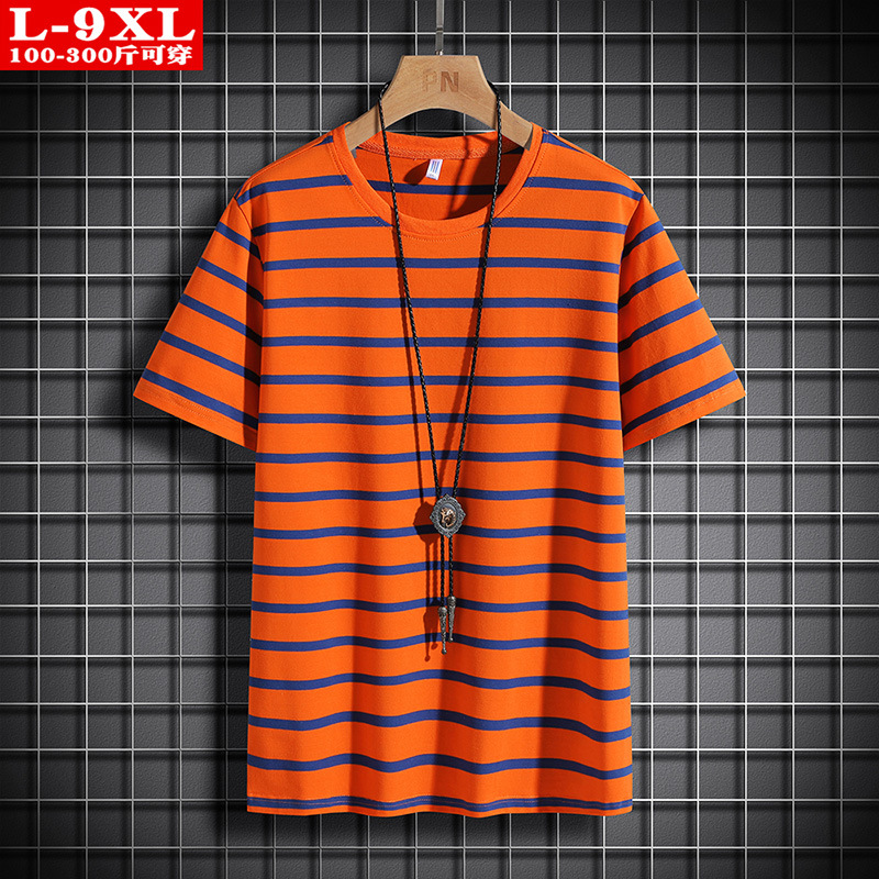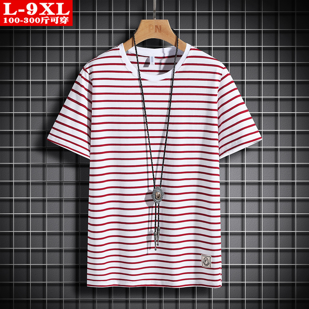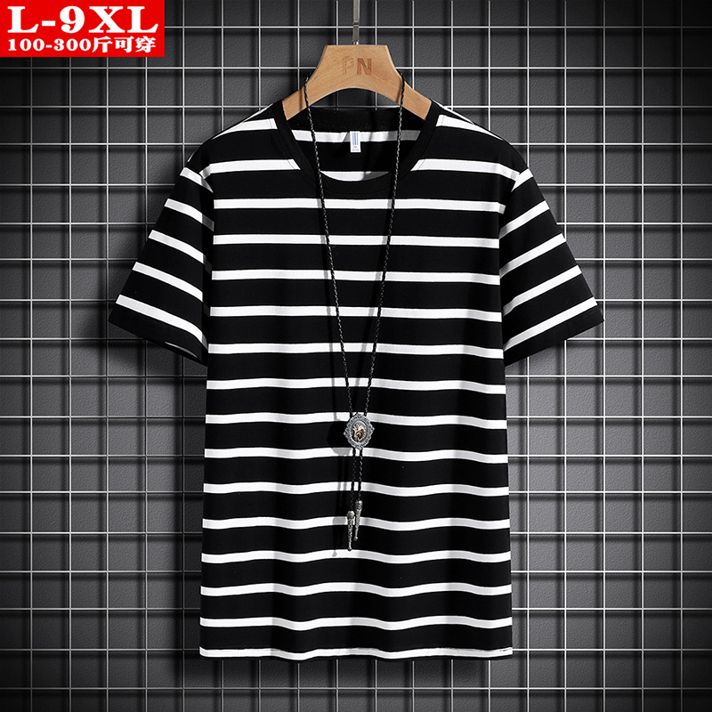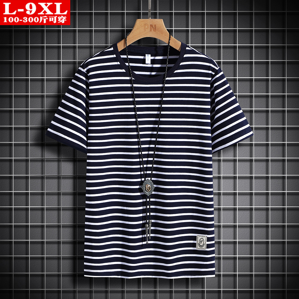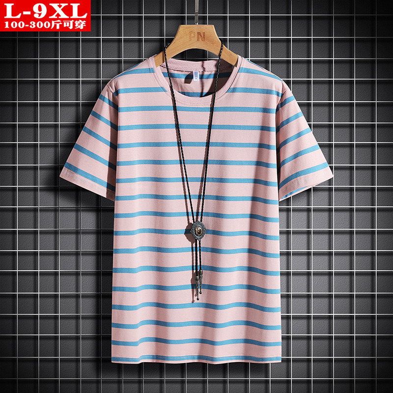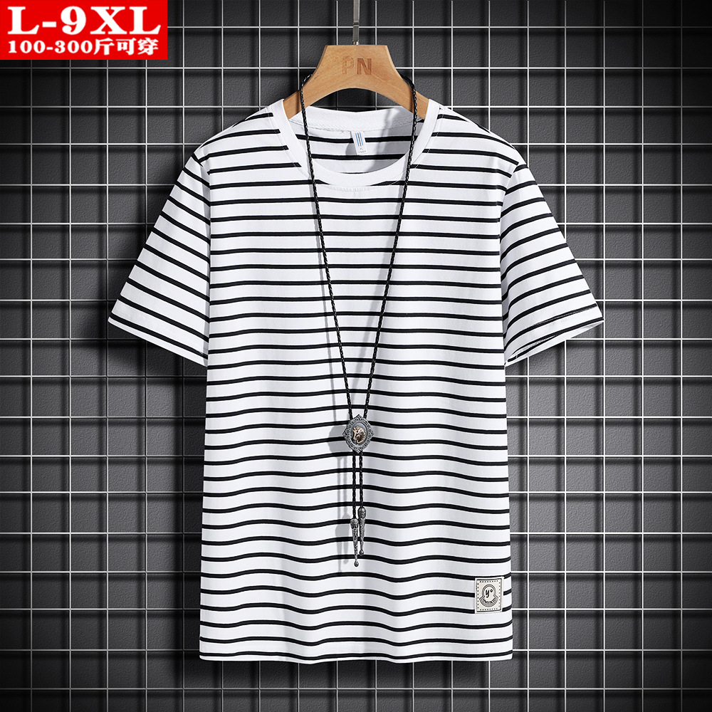 여름 트렌디 남성 크루넥 스트라이프 반팔 티셔츠 뚱뚱한 남성용 확장 대형 루즈한 면 반팔 티셔츠스토어 가기