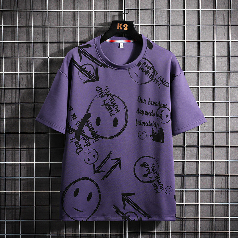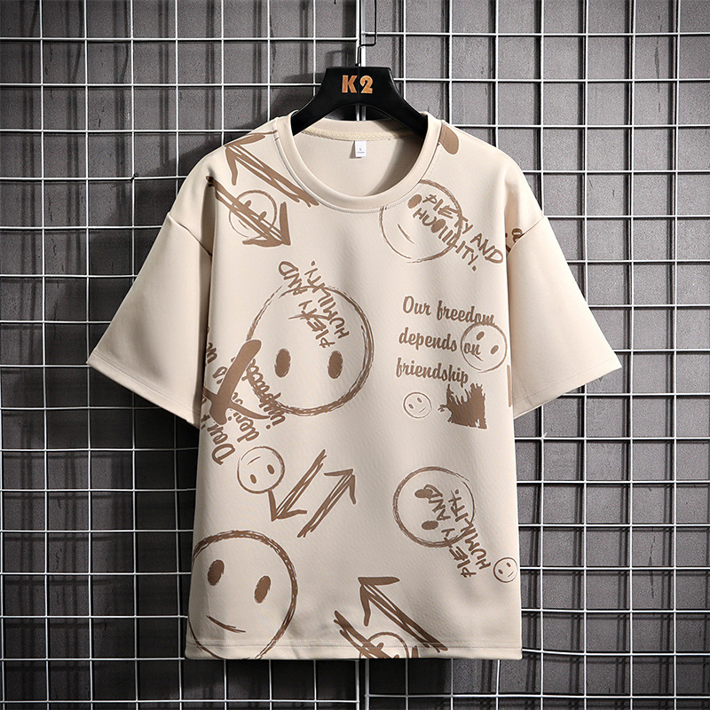 3202-2022 여름 기본 웃는 얼굴 프린트 반팔 티셔츠 남성용 미국 하이 스트리트 타이드 브랜드 크루넥 재킷