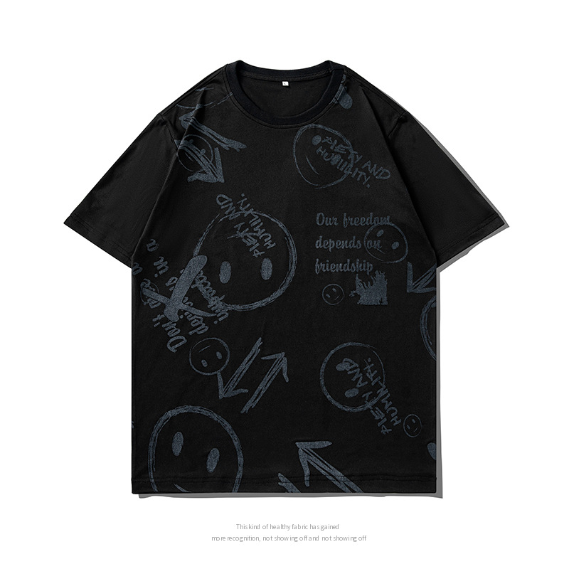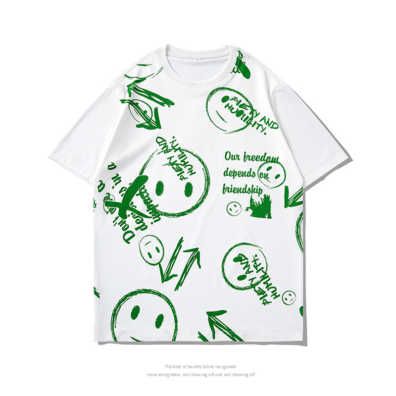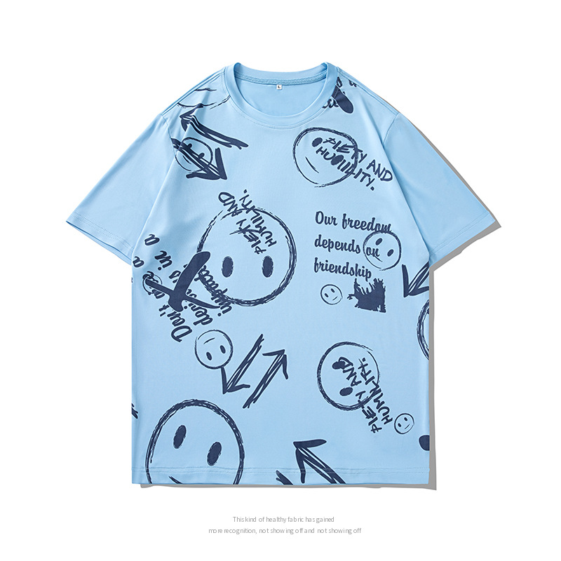 3202-2022 여름 기본 웃는 얼굴 프린트 반팔 티셔츠 남성용 미국 하이 스트리트 타이드 브랜드 크루넥 재킷스토어 가기