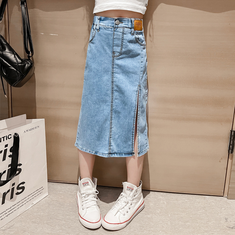 어린이 의류 소녀 데님 스커트 2024 새로운 여름 스커트 중형 및 대형 어린이 튀긴 거리 옷 어린이 슬리밍 스커트
