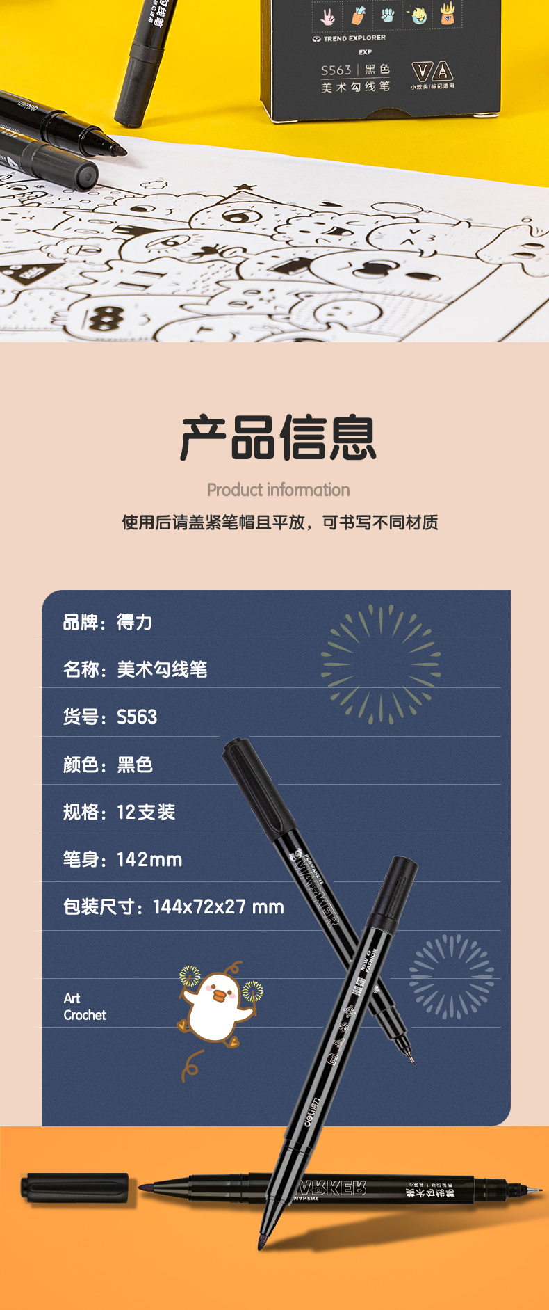 델리 S563 아트 후크 펜 검은 색 두껍고 얇은 양두 드로잉 펜 마킹 펜 어린이 그림 학생용 아트