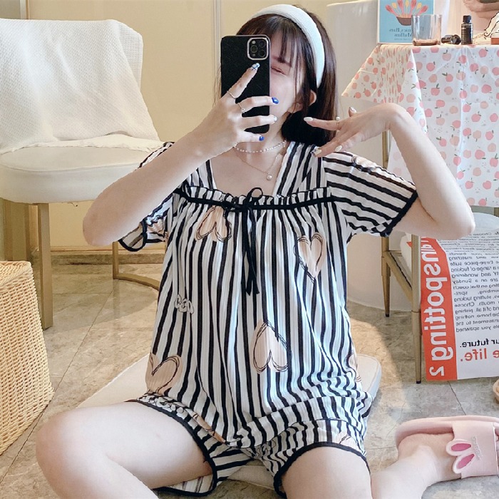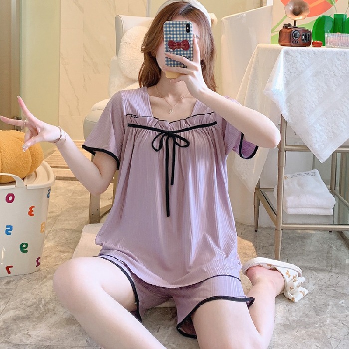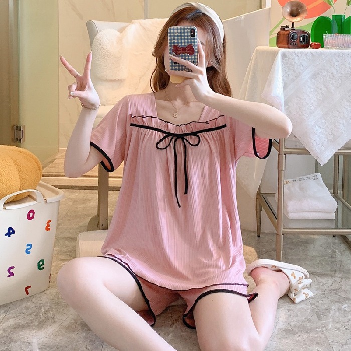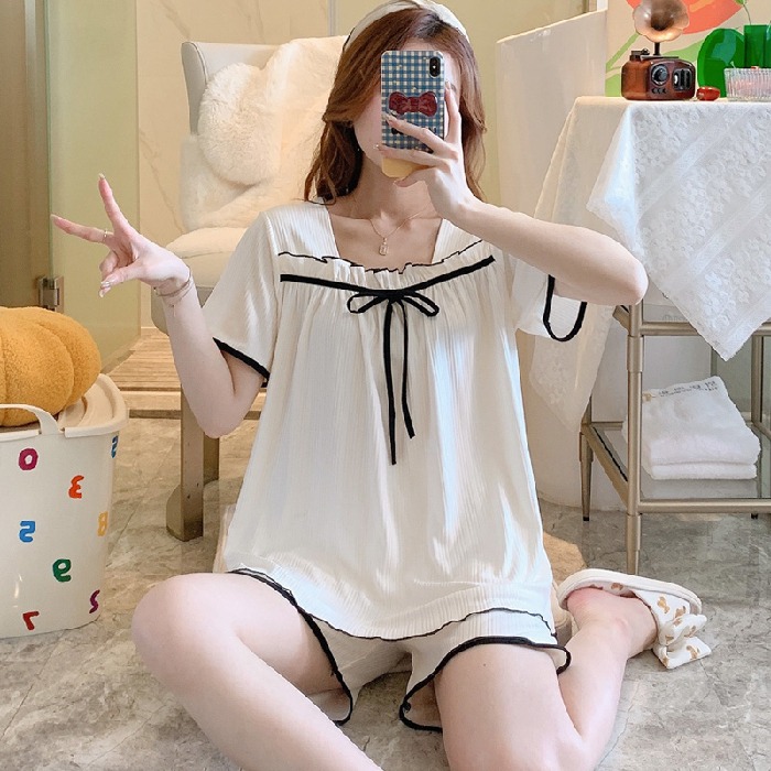 여름 반팔 반바지 잠옷 여자의 샤넬 스타일 오프 숄더 활 달콤한 구덩이 귀여운 가정 옷 세트스토어 가기