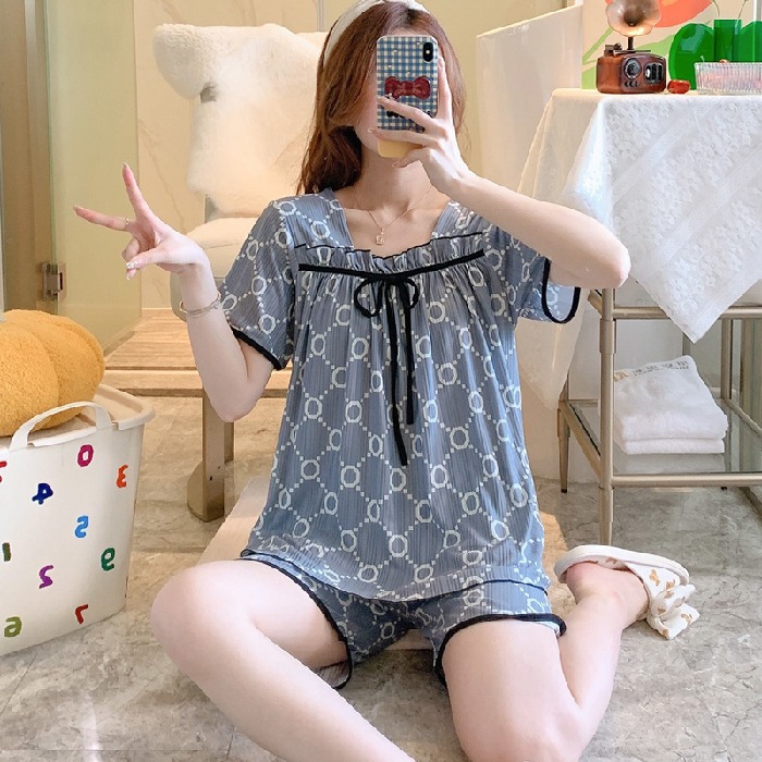 여름 반팔 반바지 잠옷 여자의 샤넬 스타일 오프 숄더 활 달콤한 구덩이 귀여운 가정 옷 세트