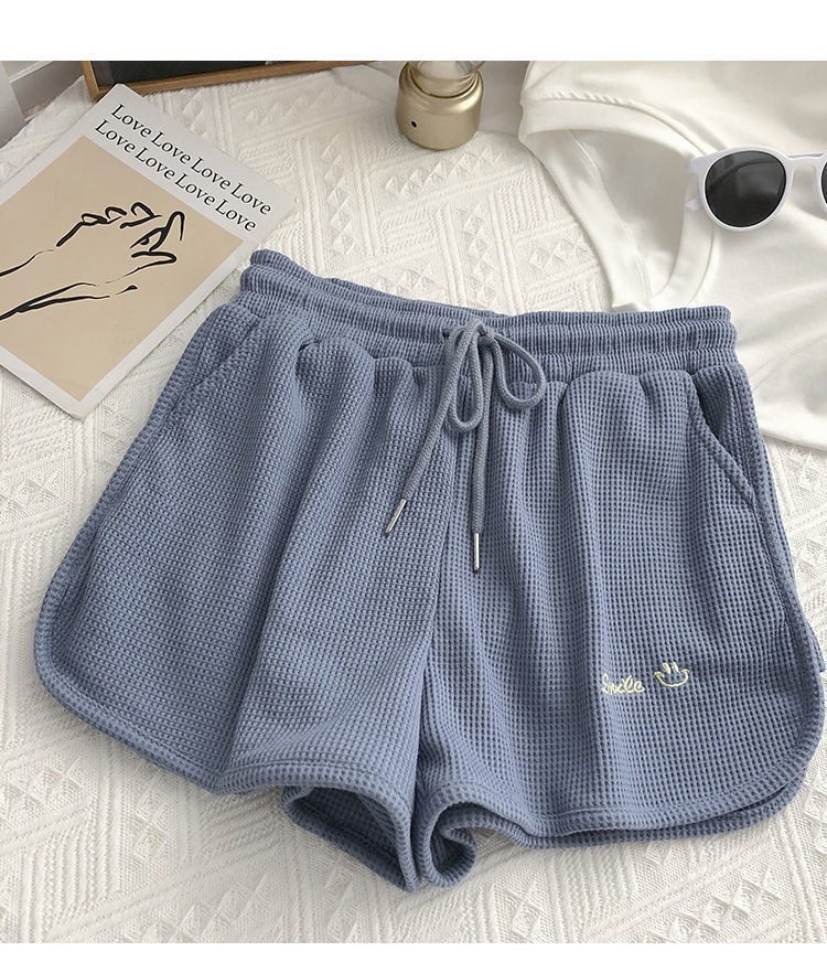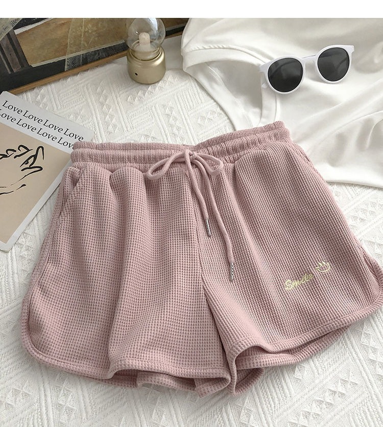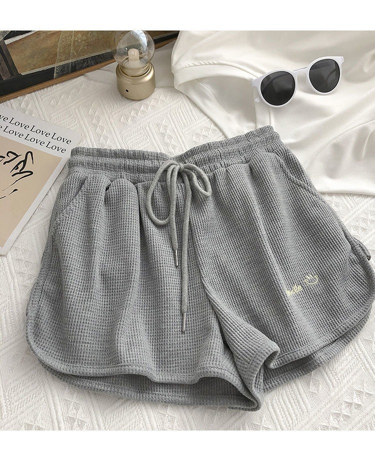 와플 편지 수 놓은 반바지 여성 여름 높은 허리 탄성 넓은 다리 바지 느슨한 캐주얼 바지 탄성 스포츠 바지 여성스토어 가기