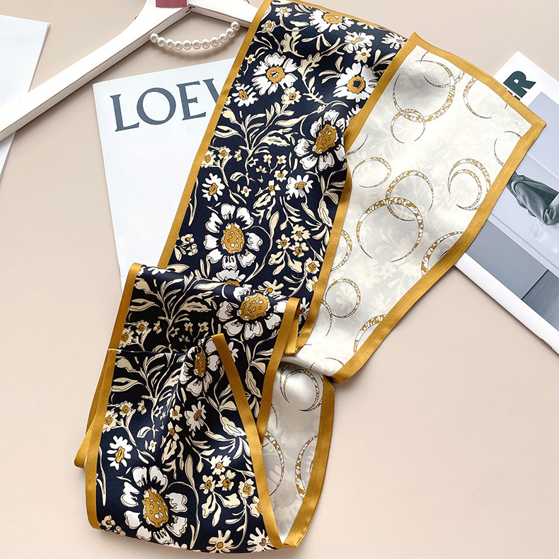 기질 패션 데이지 더블 레이어 양면 실크 작은 긴 스카프 성격 숙녀 헤어 밴드 뽕나무 실크 리본 타월