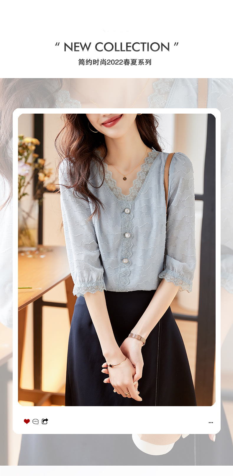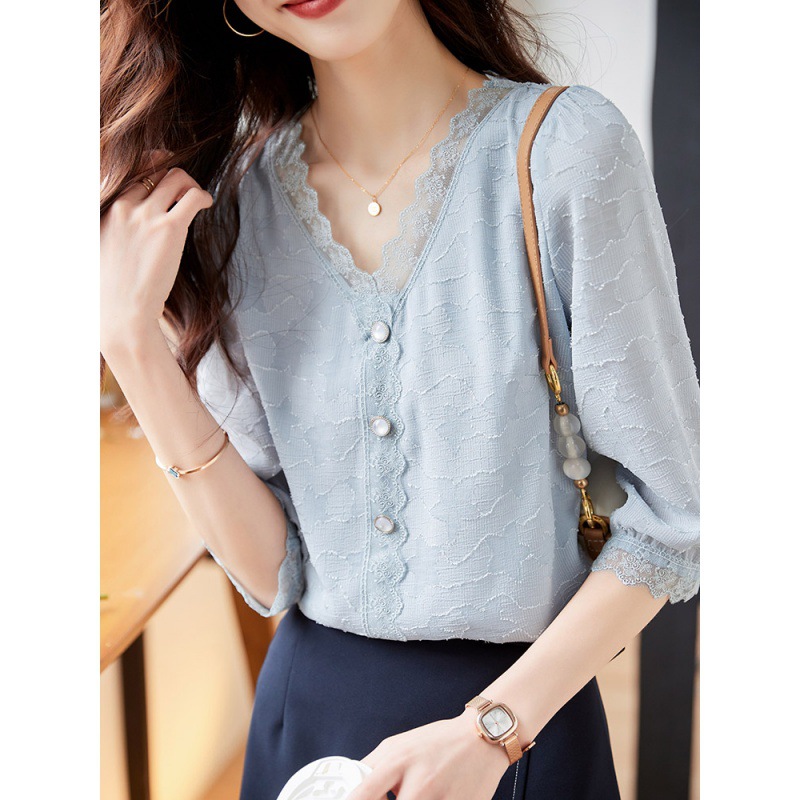 세븐포인트 슬리브 브이넥 쉬폰 셔츠 여성용 2023 년 여름 새로운 루즈한 에이지 감소 셔츠 배꼽 덮개 탑스토어 가기