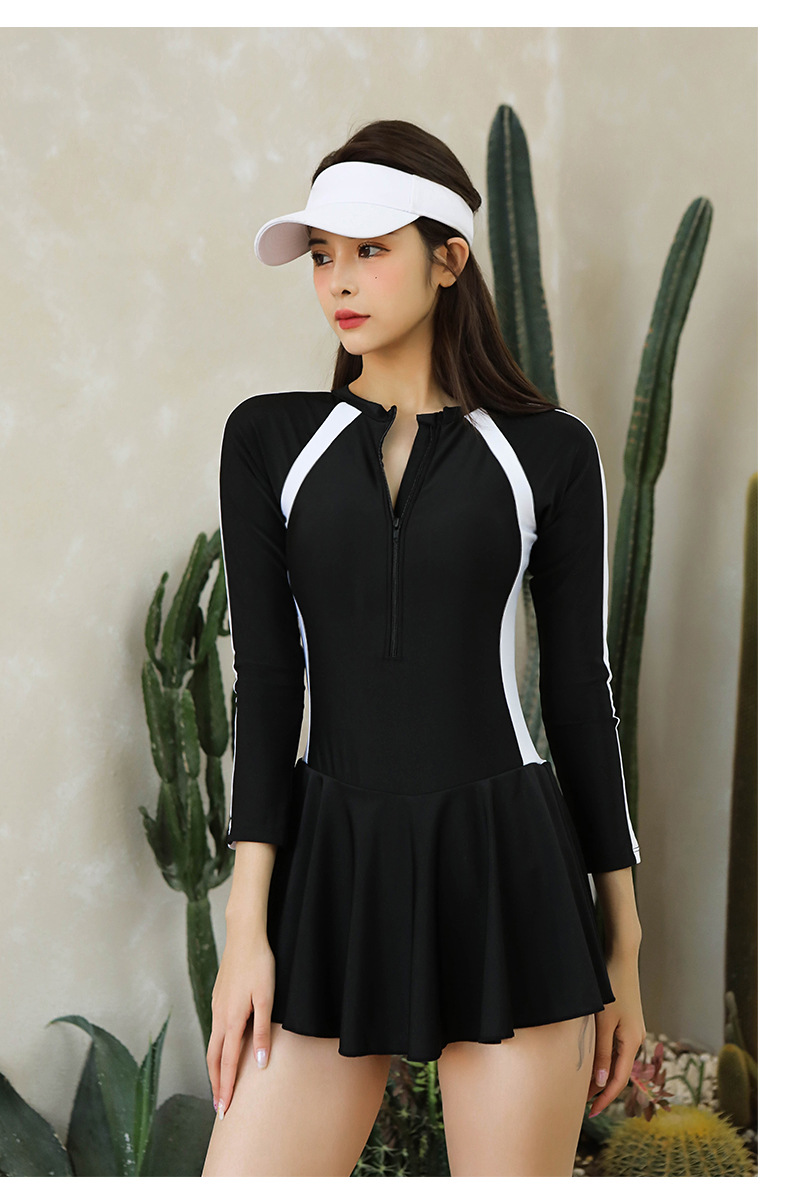 새로운 수영복 여성용 프로 스포츠 원피스 스커트 스타일 플랫 앵글 보수적 슬림 배꼽 커버 학생용 긴팔 온천 수영복