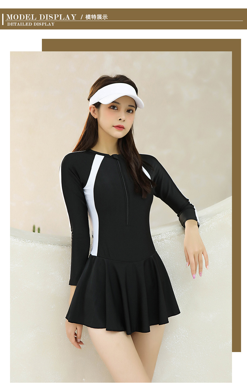 새로운 수영복 여성용 프로 스포츠 원피스 스커트 스타일 플랫 앵글 보수적 슬림 배꼽 커버 학생용 긴팔 온천 수영복스토어 가기
