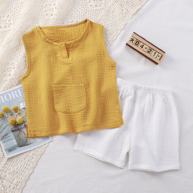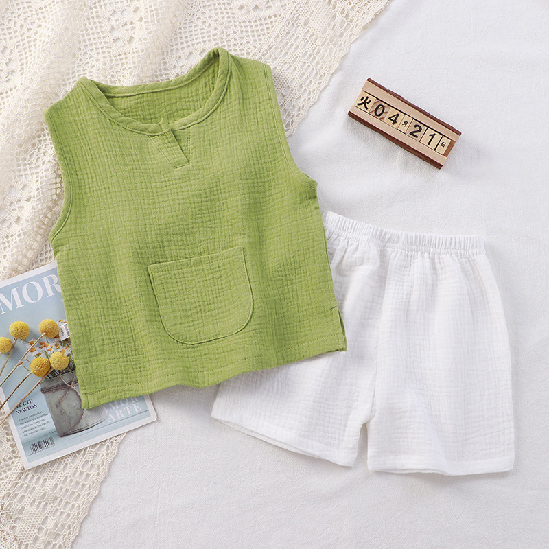어린이 세트 여름 2022 새로운 어린이 투피스 면 솔리드 컬러 더블 레이어 원사 조끼 짧은 홈 잠옷스토어 가기