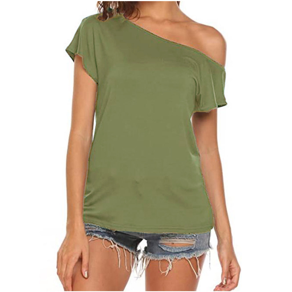 여름 유럽과 미국 의류 국경 아마존 이베이 슬로프 칼라 오프 숄더 섹시한 불규칙한 여성용 반팔 티셔츠