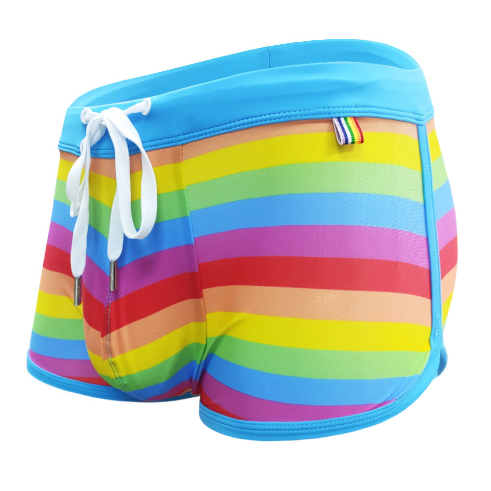 UXH 유럽과 미국 남자 스플릿 복서 스포츠 수영 트렁크 블루 컬러 스트라이프 패션 테더 네 코너 비치 복서 바지 남자