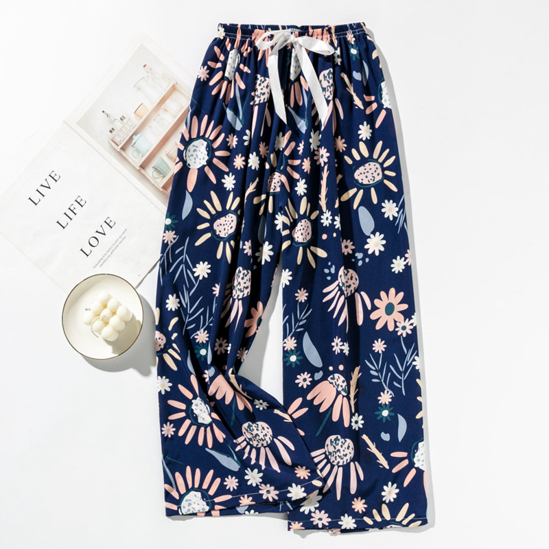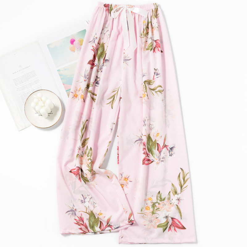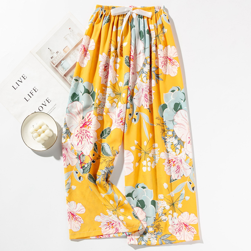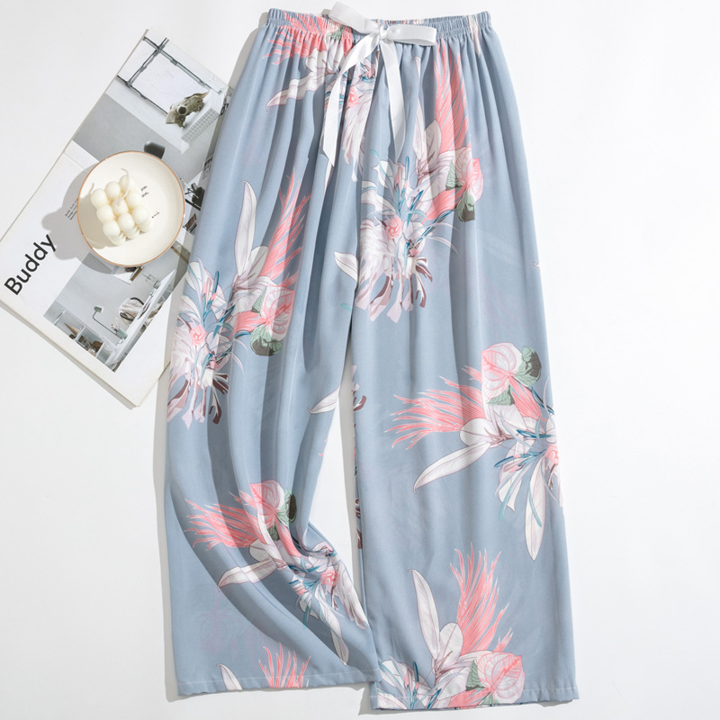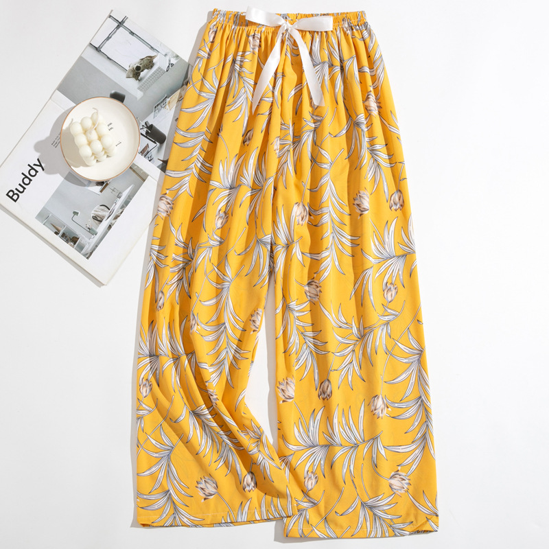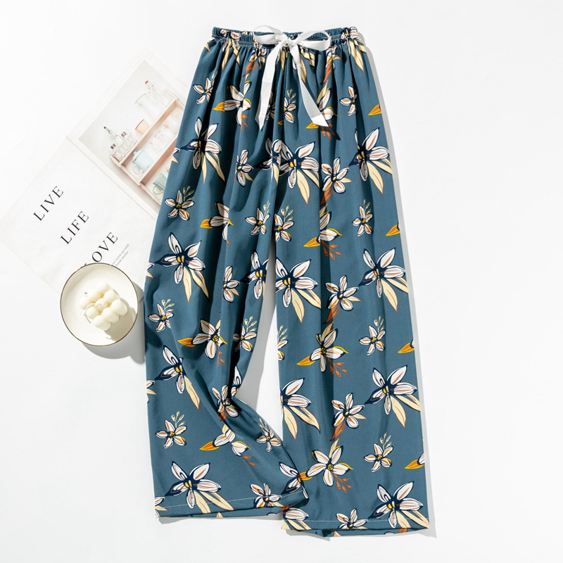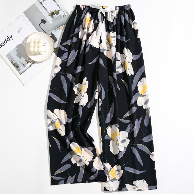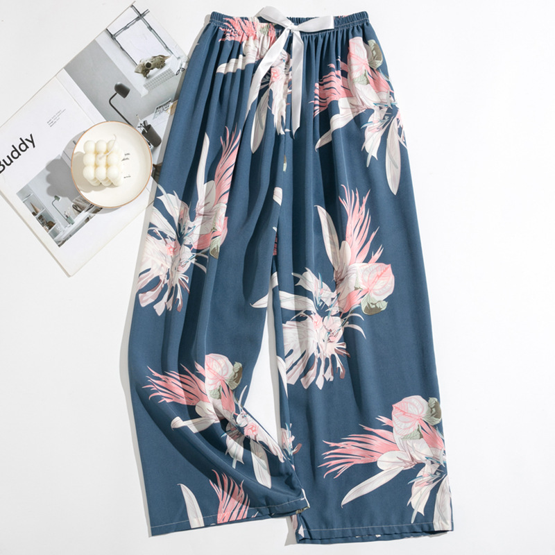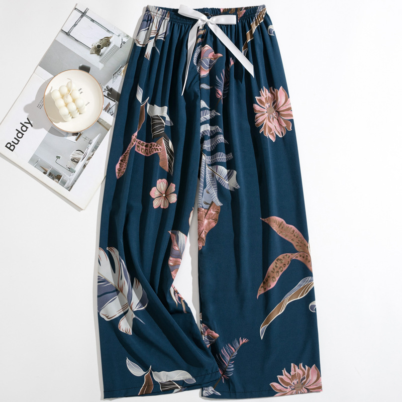 봄과 여름 새로운 대외 무역 면 실크 잠옷 바지 여자의 얇은 편안한 느슨한 플러스 사이즈 와이드 다리 바지 벽 면 만화 바지스토어 가기