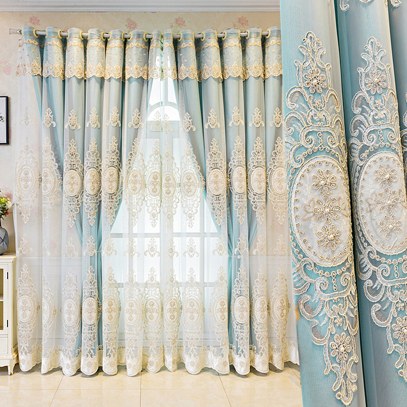 유럽식 고급 네일 비즈 벨벳 자수 커튼 2 층면 및 린넨 거실 침실 음영 도매 마감