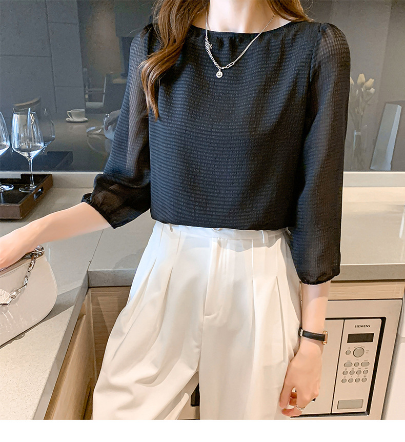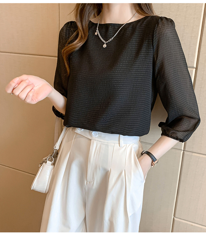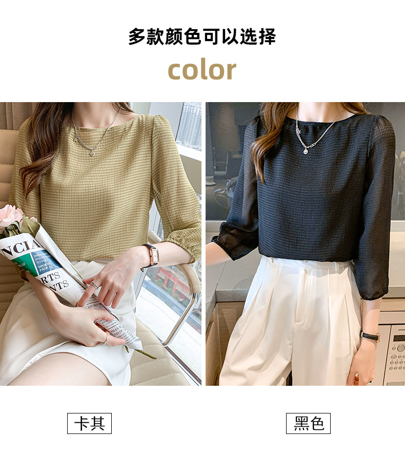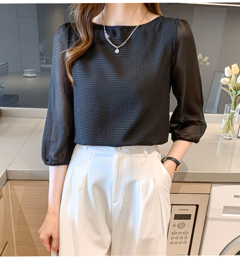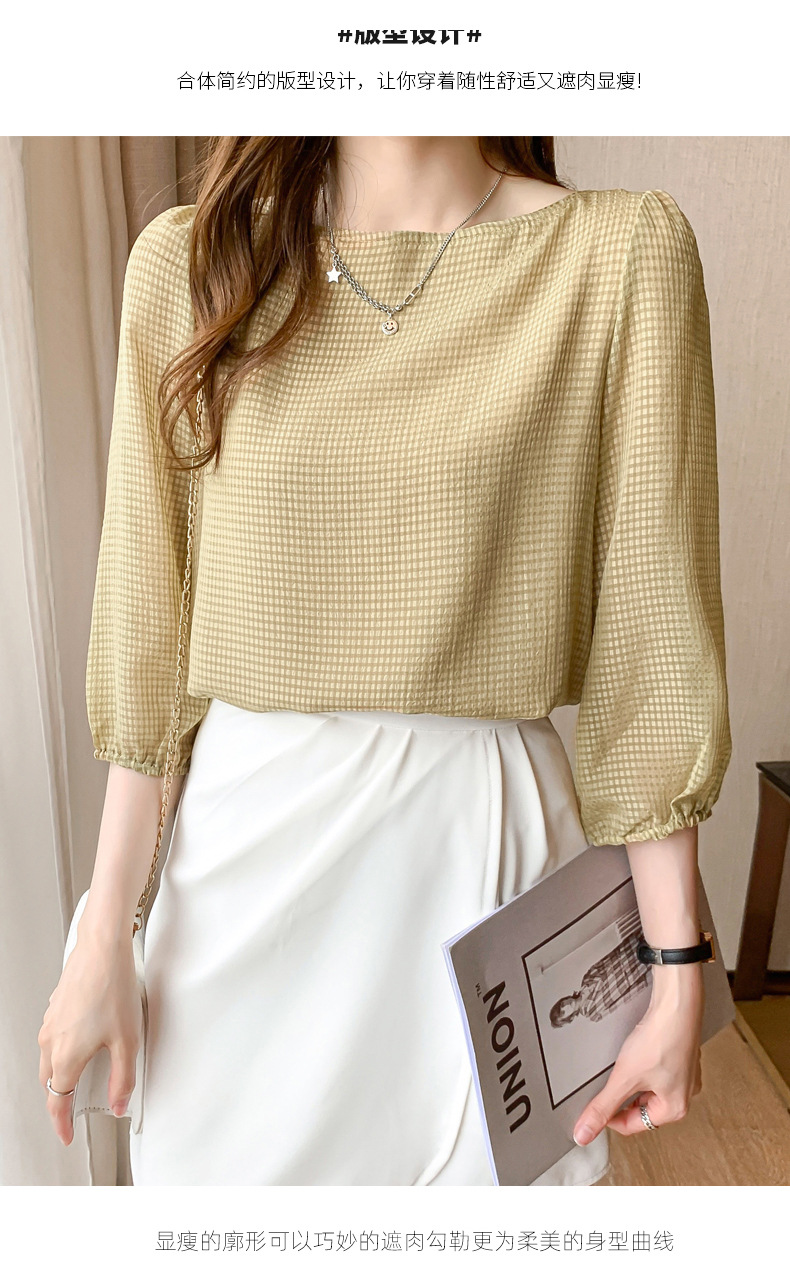 2026년 신상 여성 여름 셔츠, 여성스럽고 세련된 7부 소매 상의, 원라인 네크라인, 루즈핏 랜턴 소매 쉬폰 셔츠스토어 가기