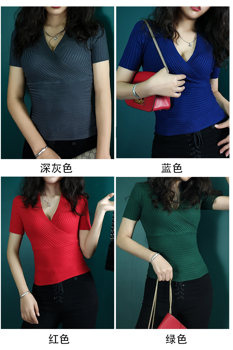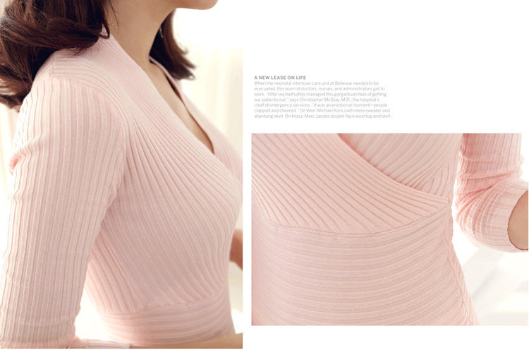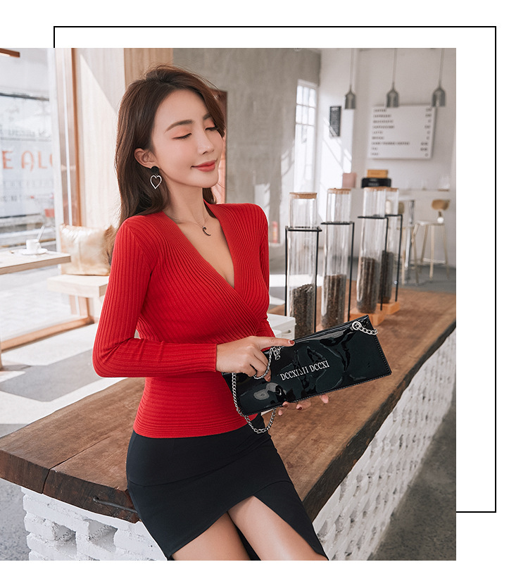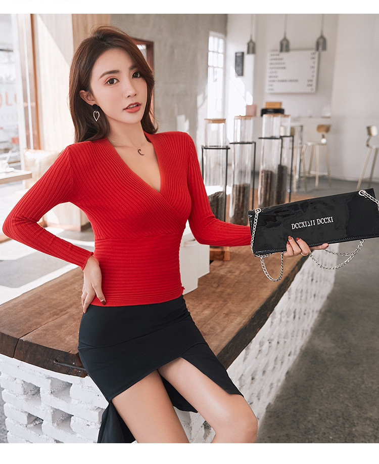 봄과 가을 새로운 로우 컷 타이트 섹시 스웨터 여성용 스레드 긴팔 크로스 딥 브이넥 니트 베이스 셔츠 탑