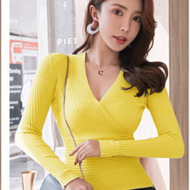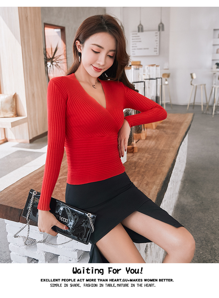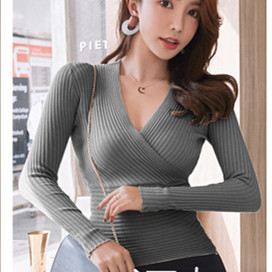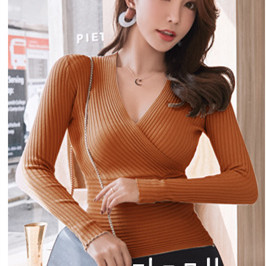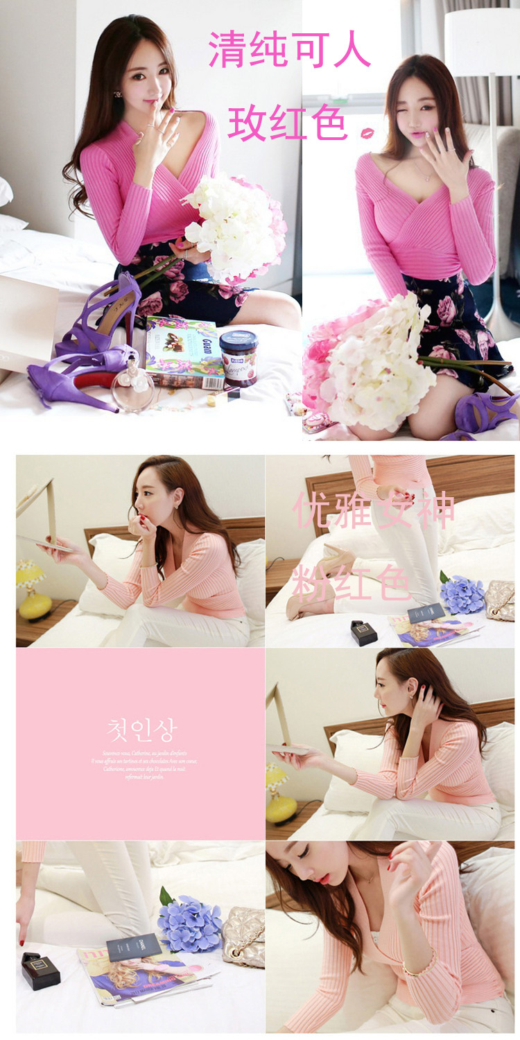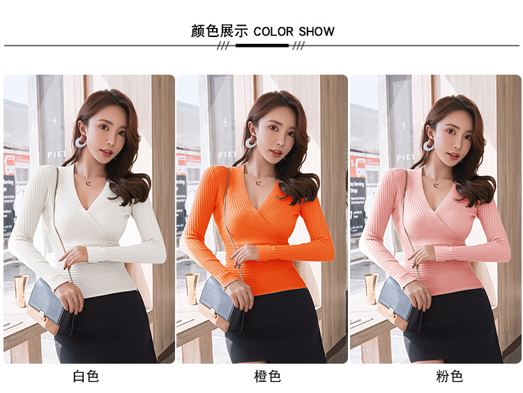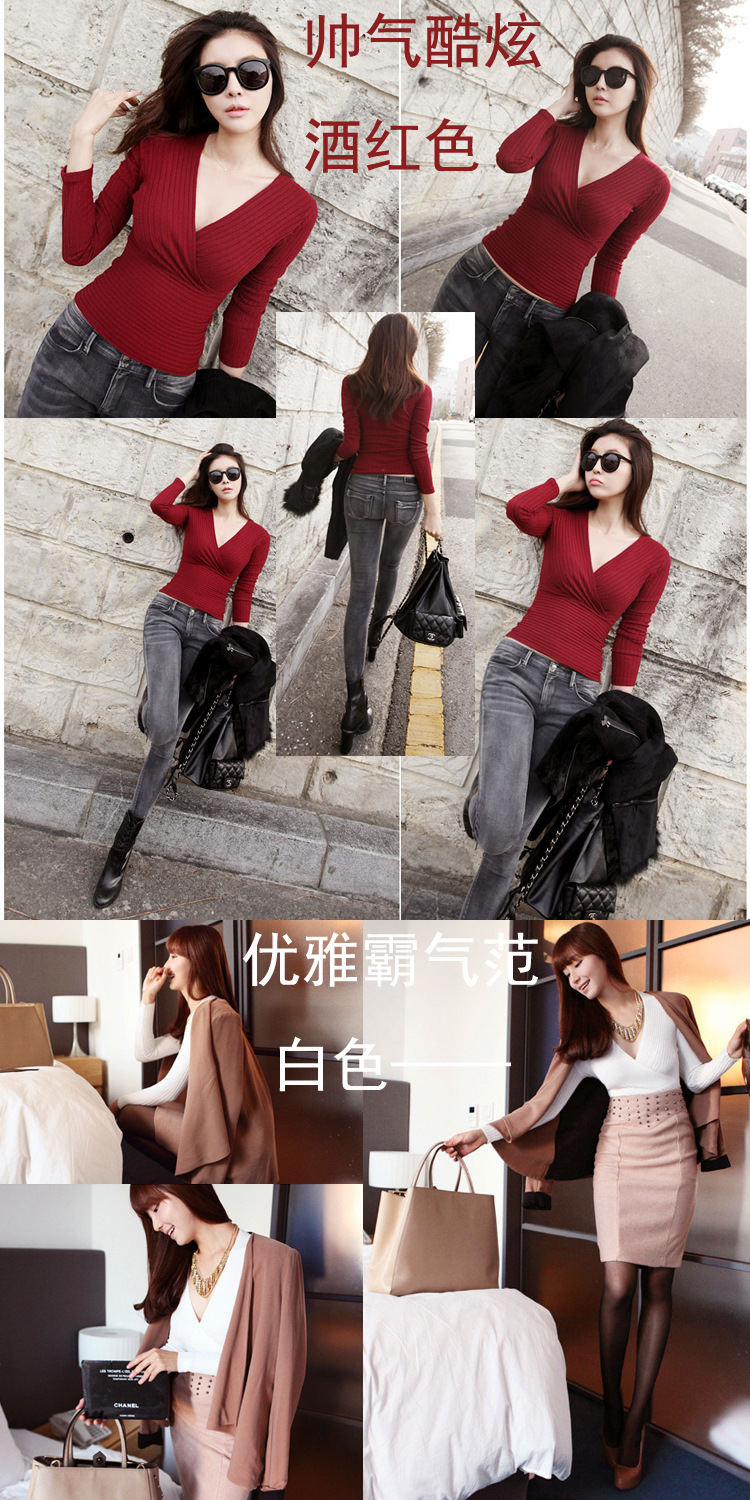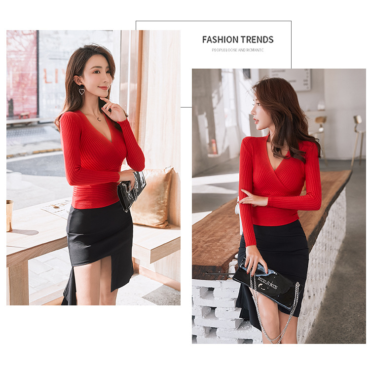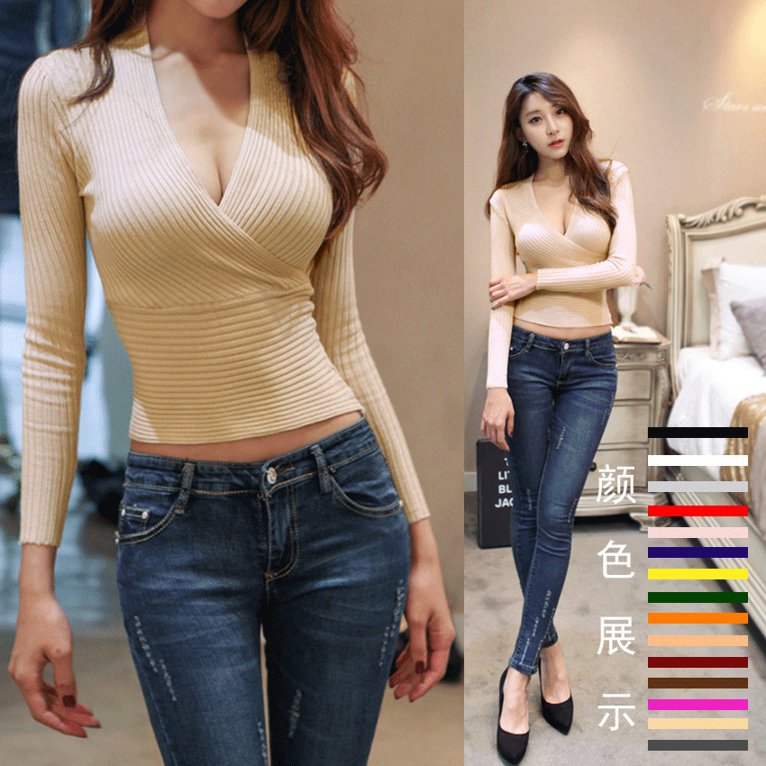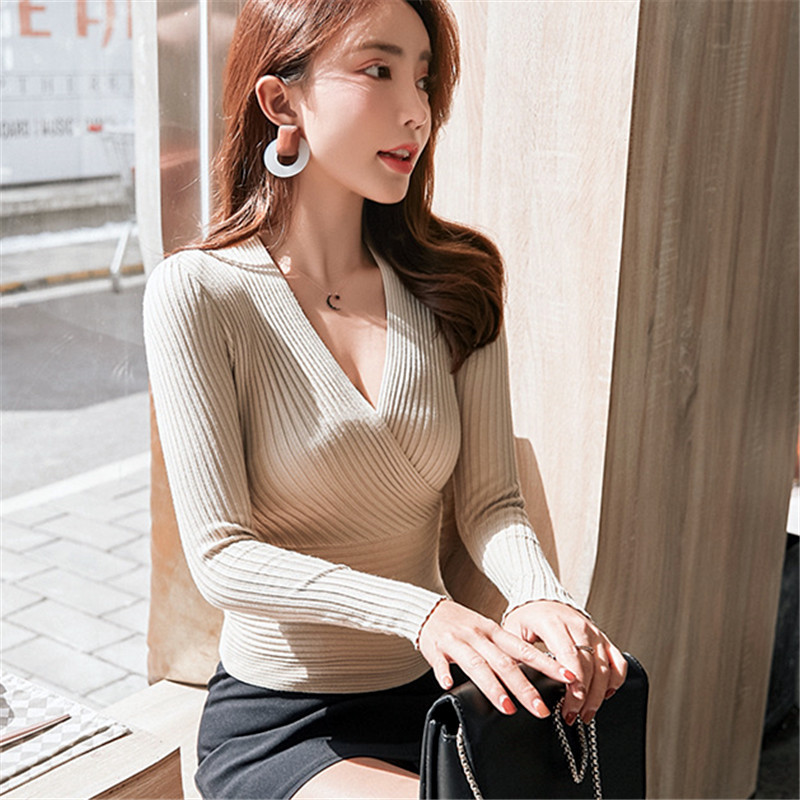 봄과 가을 새로운 로우 컷 타이트 섹시 스웨터 여성용 스레드 긴팔 크로스 딥 브이넥 니트 베이스 셔츠 탑스토어 가기