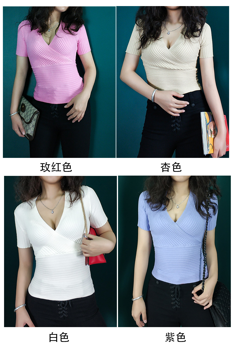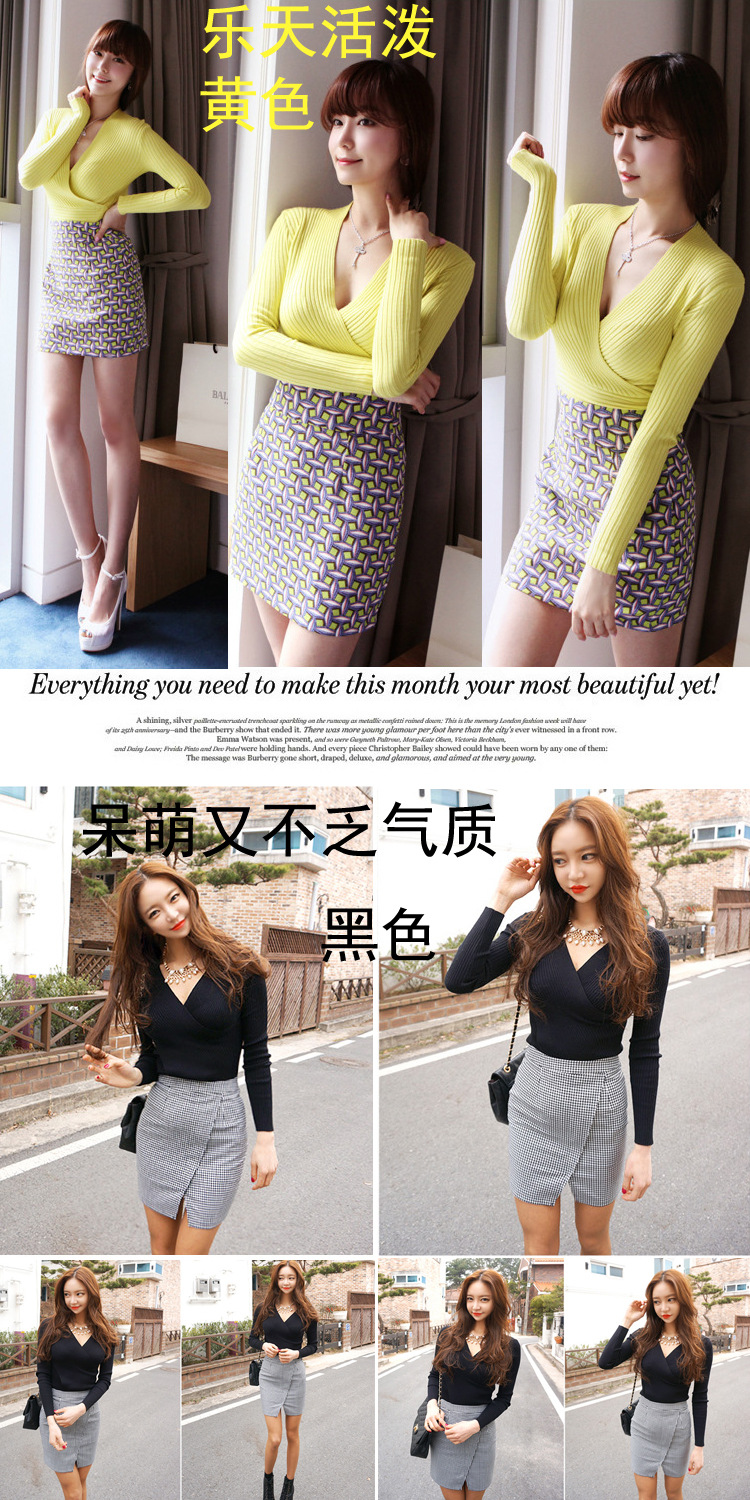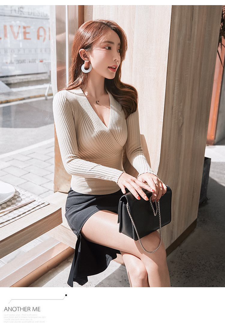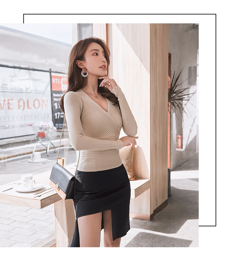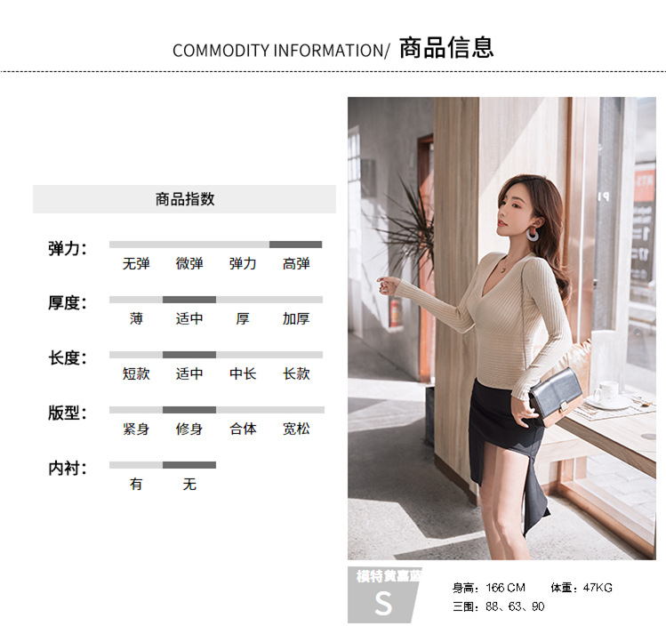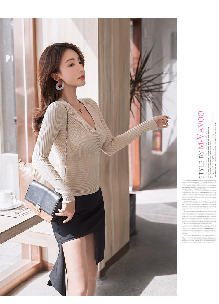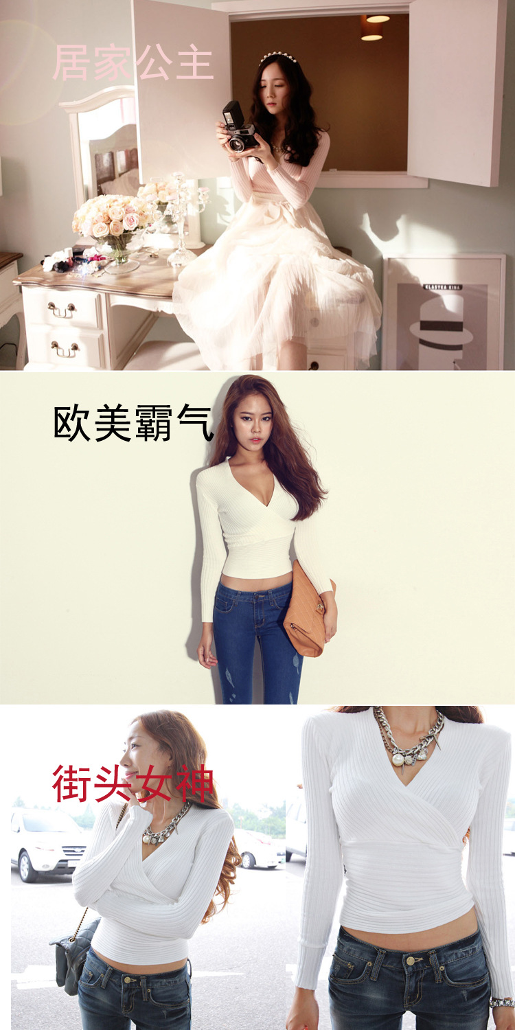 봄과 가을 새로운 로우 컷 타이트 섹시 스웨터 여성용 스레드 긴팔 크로스 딥 브이넥 니트 베이스 셔츠 탑스토어 가기