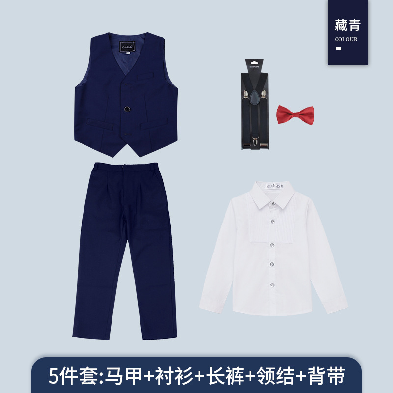 • 네이비 양복 조끼 + 바지 + 긴 소매 주름 셔츠 (빨간 나비 넥타이, 스트랩)