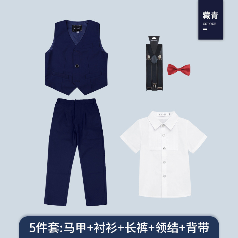 • 네이비 조끼 + 바지 + 반팔 주름 셔츠 (빨간 나비 넥타이, 스트랩)