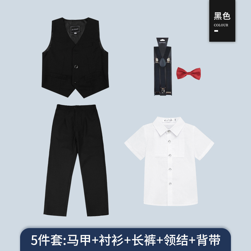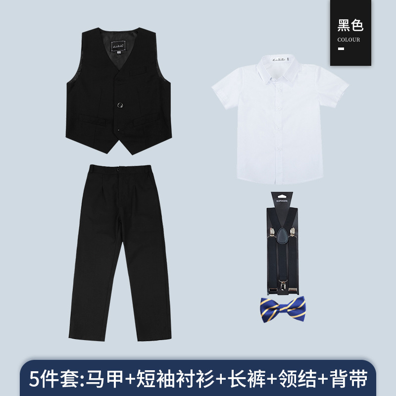 • 검은 조끼 + 바지 + 반팔 단색 셔츠 (나비 넥타이, 스트랩 보내기)