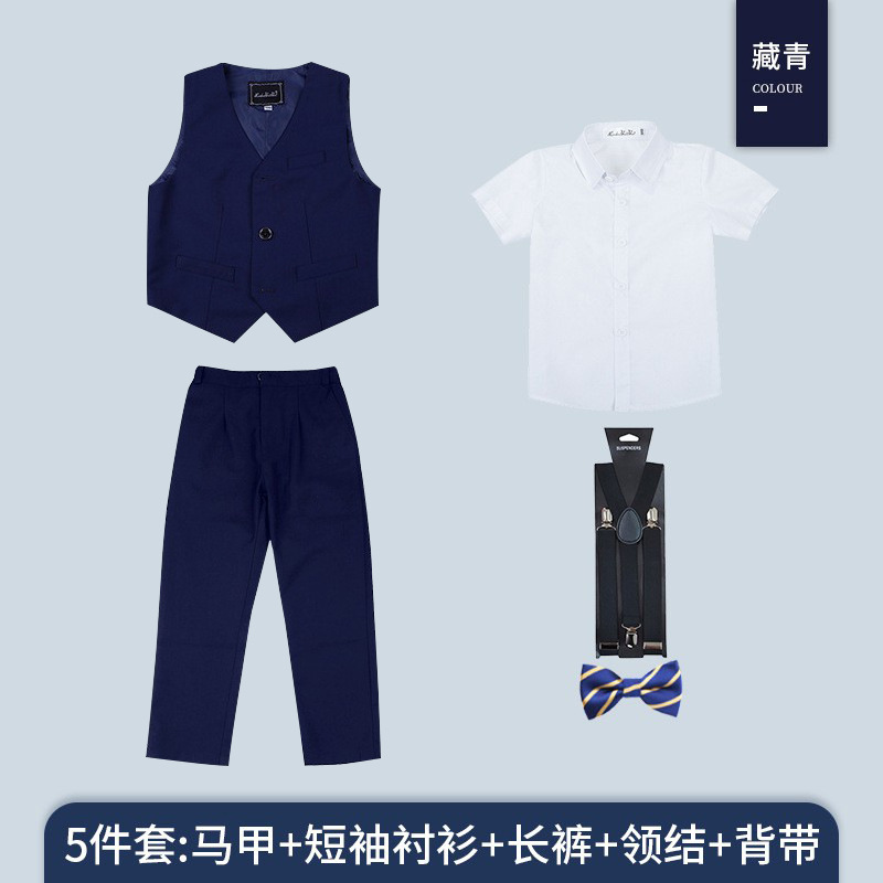 • 네이비 양복 조끼 + 바지 + 반팔 단색 셔츠 (나비 넥타이, 스트랩)