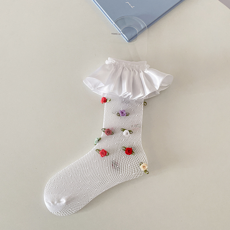한국 스타일 프랑스 스타일 소녀 중공업 디자인 캔디 컬러 수제 꽃 폴카 도트 새틴 대형 레이스 송아지 양말 중반