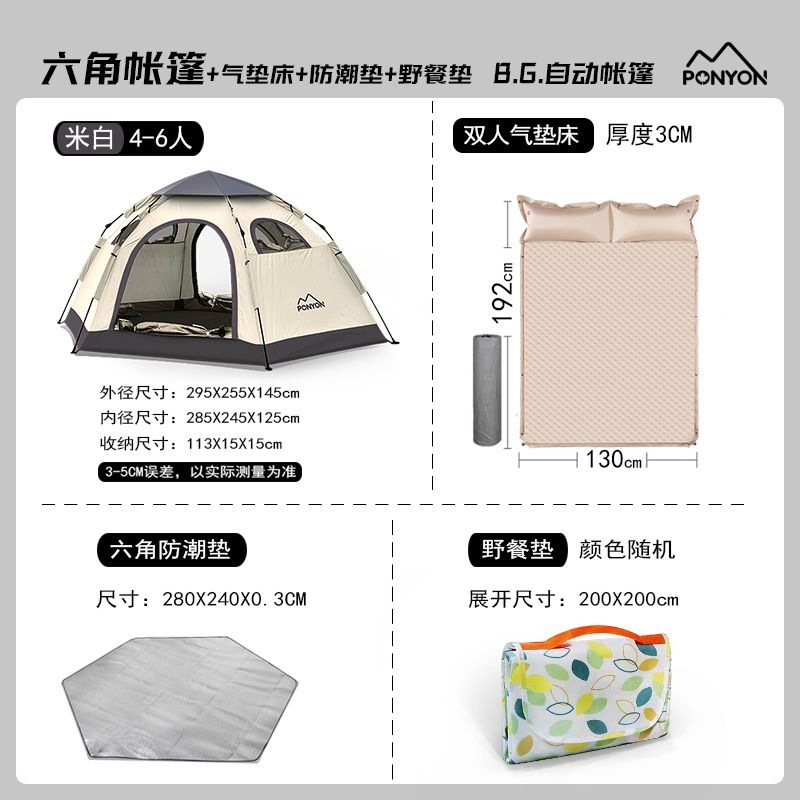 • 대형 사이즈 - 황백색 육각형 텐트 + 방습 매트 + 피크닉 매트 + 베개가 포함된 더블 에어 매트리스 [4-6인]