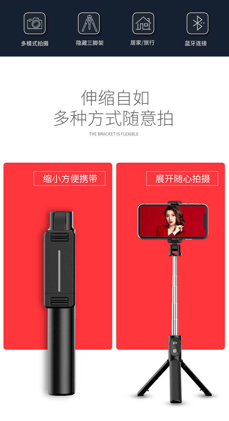 소스 공장 편리한 블루투스 셀카 스틱 통합 삼각대 수평 화면 카메라 전화 셀카 스틱 도매스토어 가기