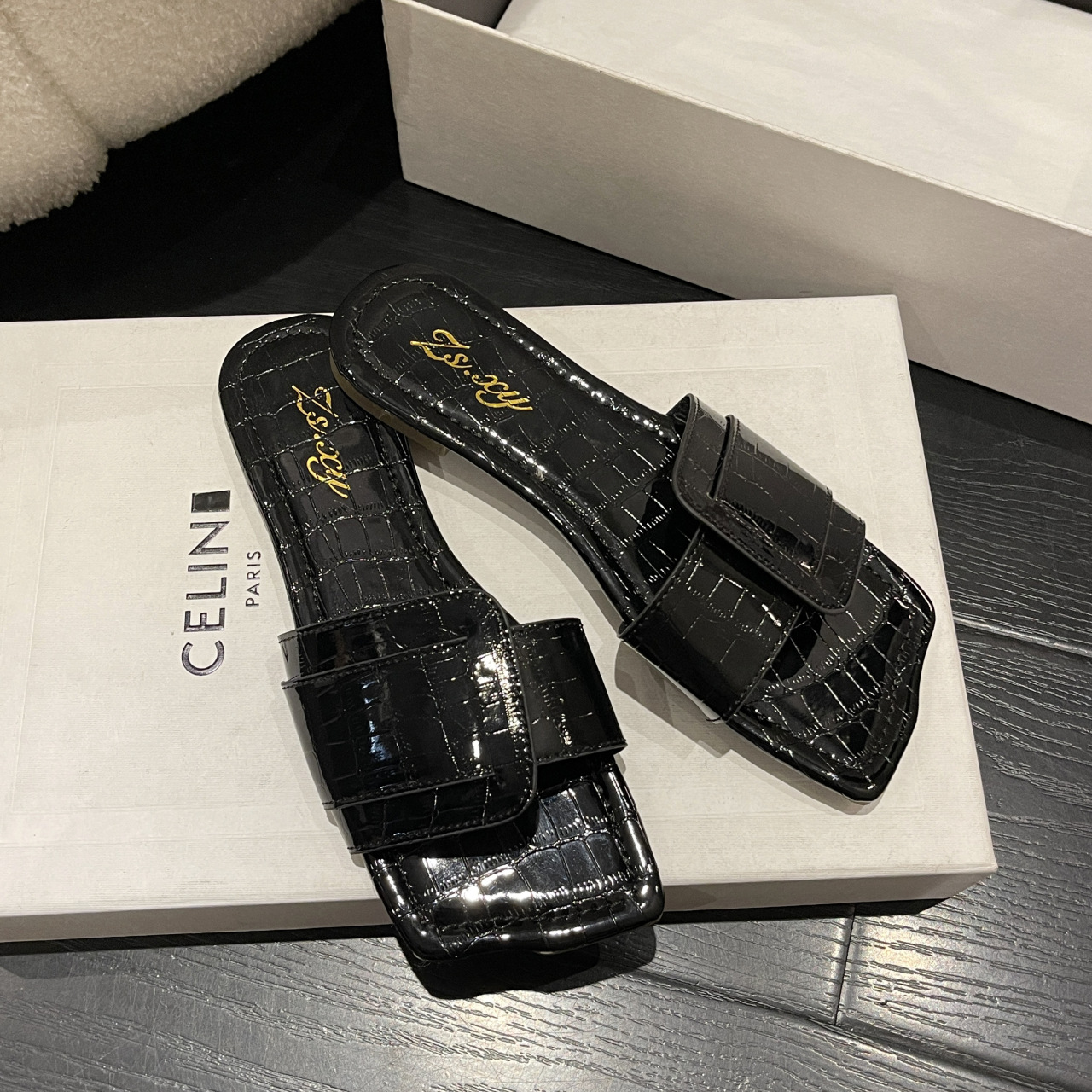 한국 스타일 유행 광장 발가락 플랫 슬리퍼 여성의 2024 여름 새로운 단색 슬라이드 외부 착용 캐주얼 소프트 하단 샌들스토어 가기