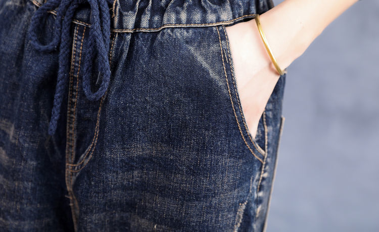 [재고] 루즈한 청바지 여성의 새로운 탄성 허리 캐주얼 플러스 사이즈 빈티지 패치 자수 고민 하렘 바지