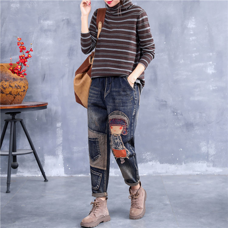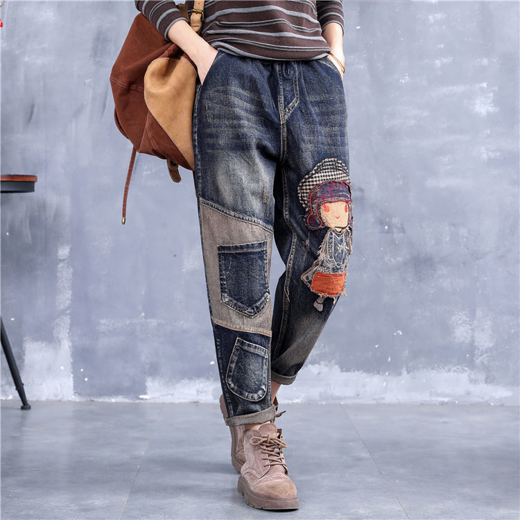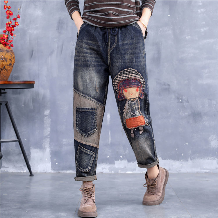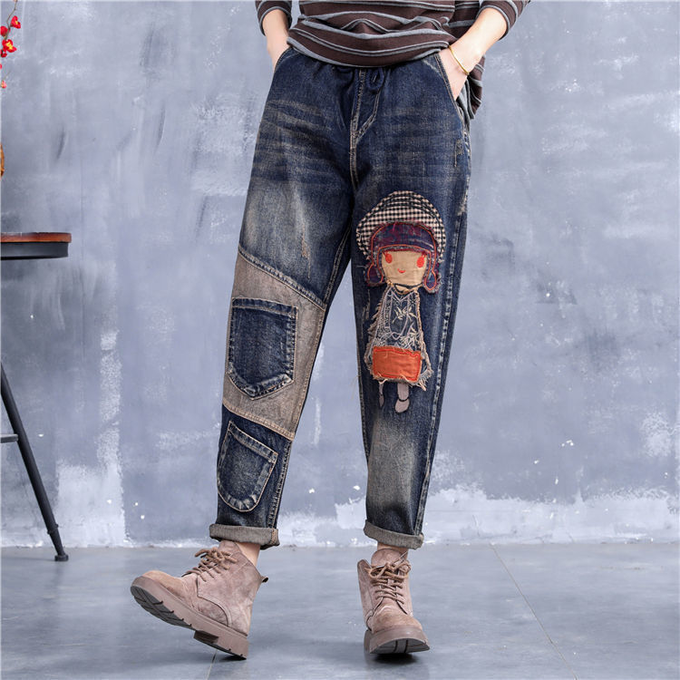 [재고] 루즈한 청바지 여성의 새로운 탄성 허리 캐주얼 플러스 사이즈 빈티지 패치 자수 고민 하렘 바지스토어 가기