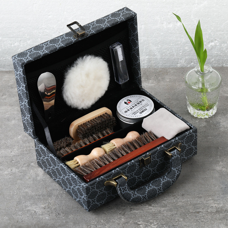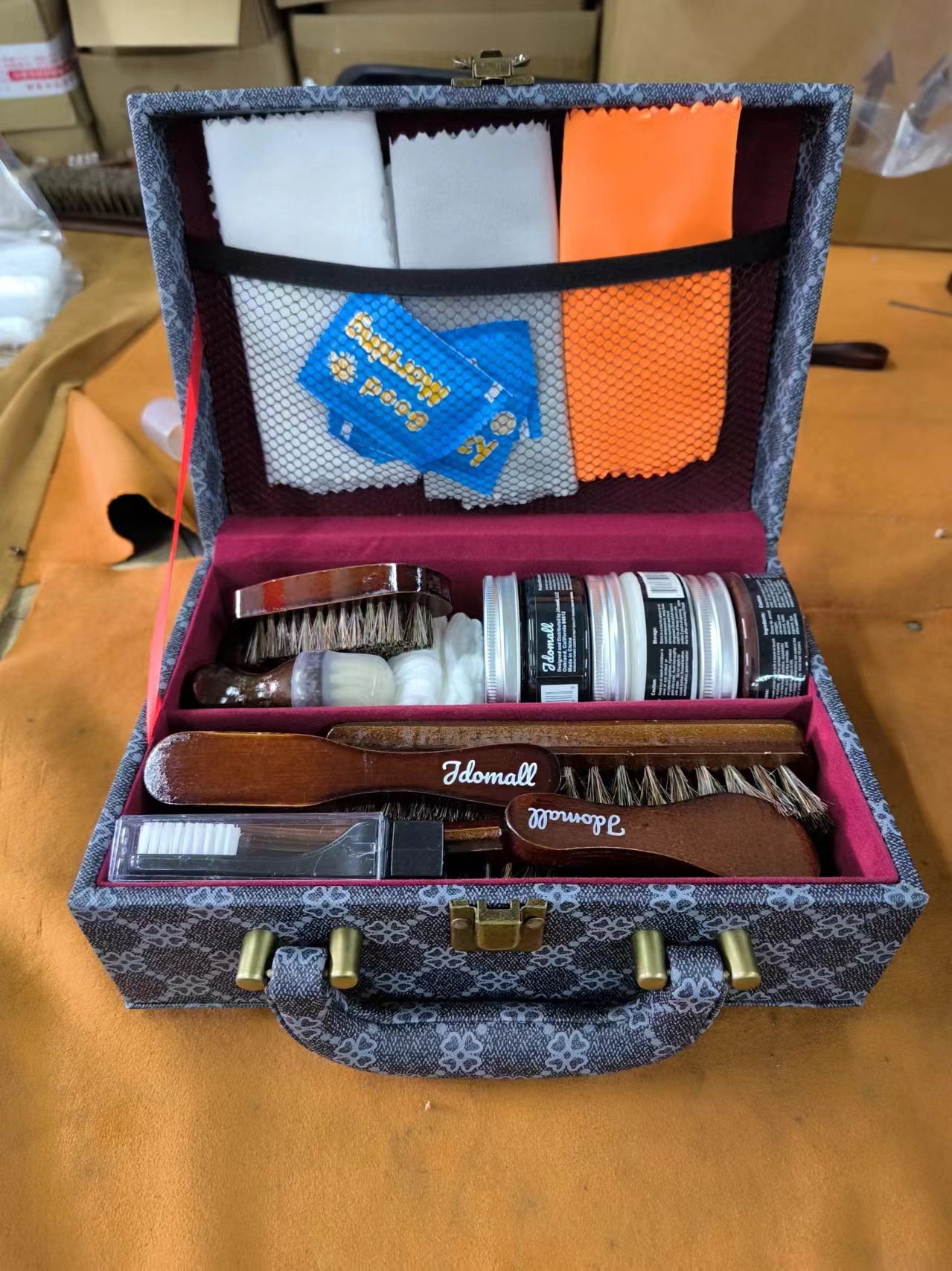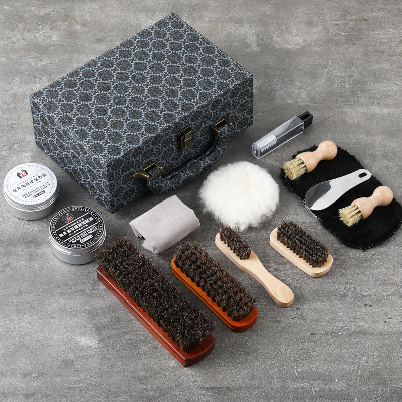 内含:大号马毛刷+中号马毛刷+小号马毛刷+长条马毛刷+边缘刷+2个取油刷+抛光布2张+擦鞋手套+不锈钢鞋拨+羊毛抛光球+黑色绵羊油+白色绵羊油