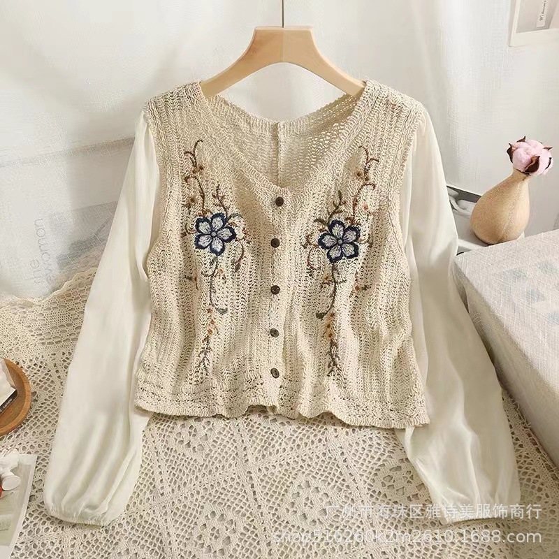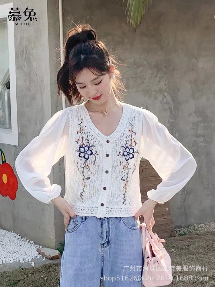 여름 달콤한 빈티지 예술적 대비 색상 스티치 자수 버블 슬리브 쉬폰 셔츠 틈새 선 스크린 느슨한 짧은 얇은 여성스토어 가기