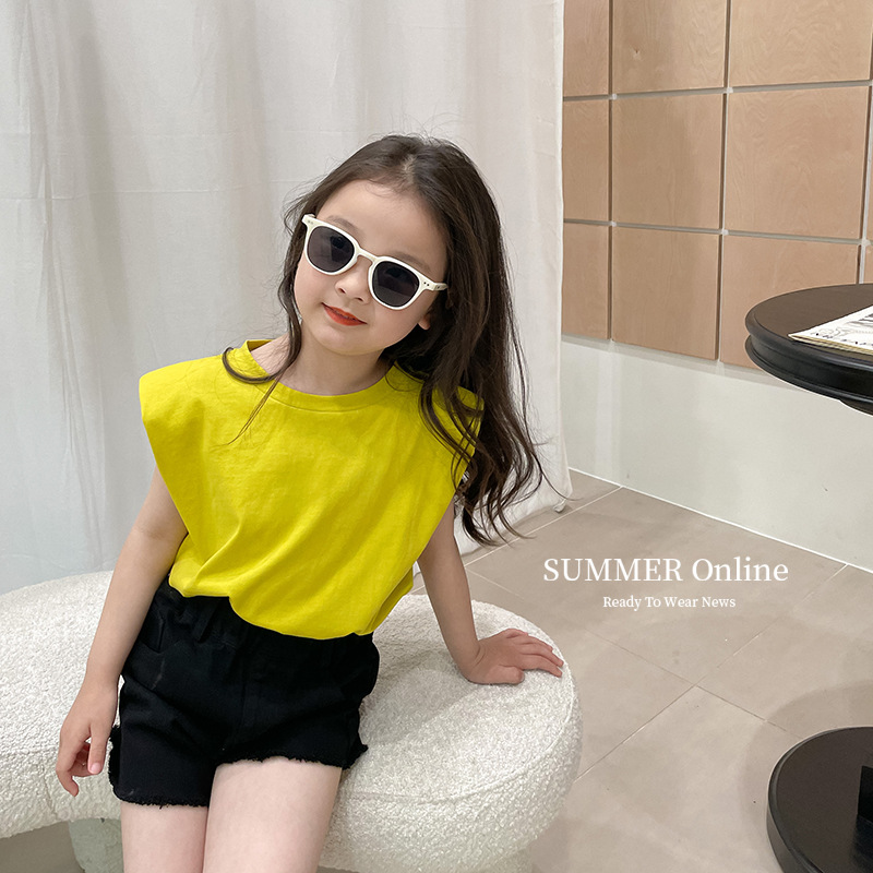 Emo Beibei 여아 우아한 패딩 숄더 민소매 탑 아동 반팔 2023 여름 아동복 한국 티셔츠스토어 가기
