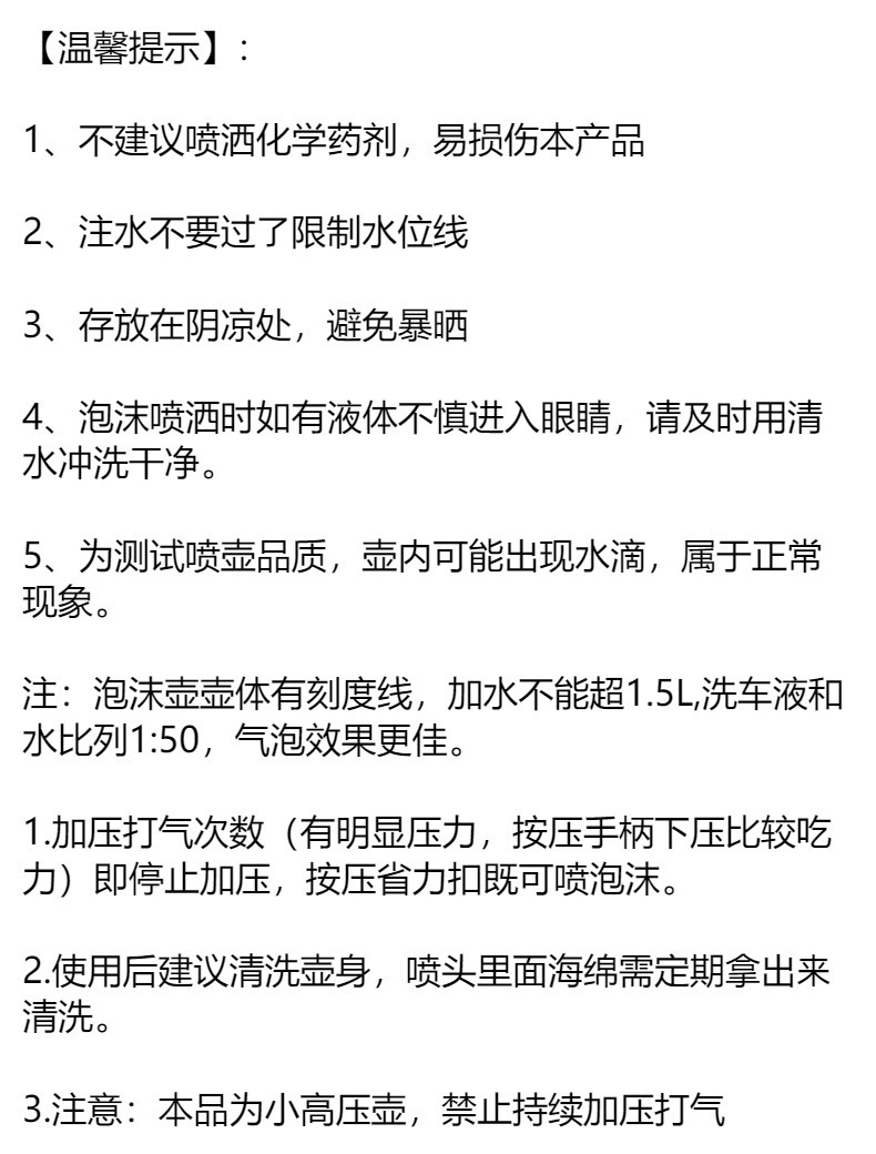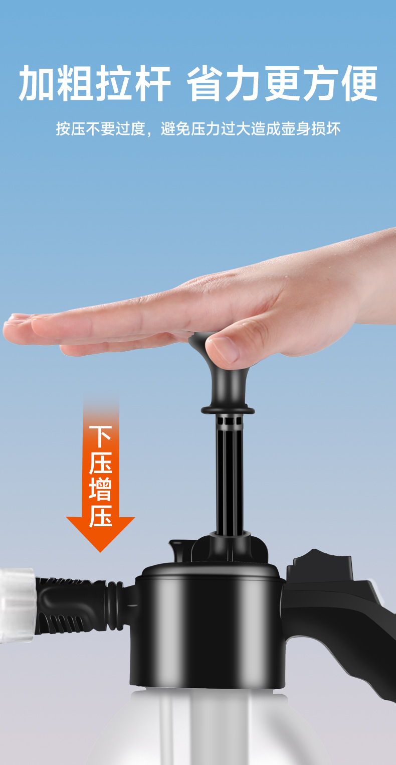 【产品特点】:1、PP,PE料,加厚瓶身2、人性化手柄更舒适3、铝氧化拉杆,防止压到手指,打压更轻松4、带开关锁,释放双手,实现自动喷酒5、大口径,方便各种水龙头接水